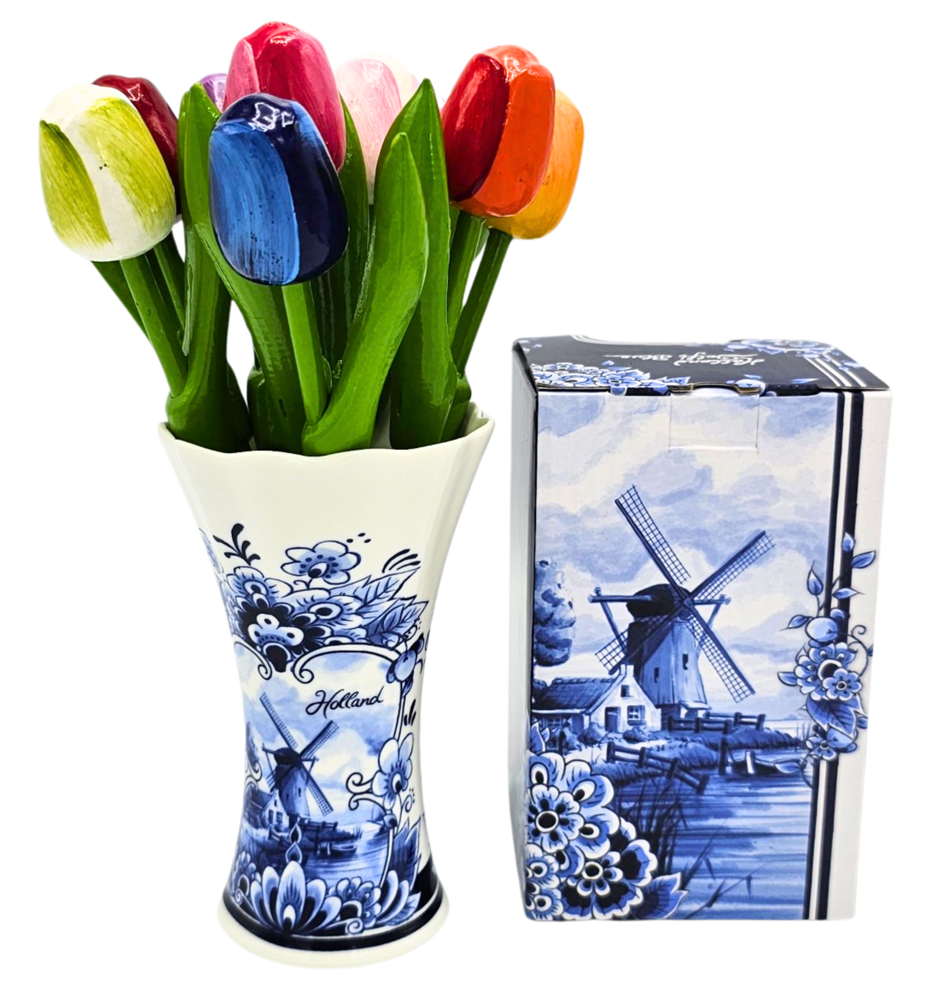 9 handbemalte, mehrfarbige Tulpen aus Holz. Die Vase ist aus Steingut. Das schönste und perfekteste Geschenk von Typisch Hollands – einfach online bestellen.