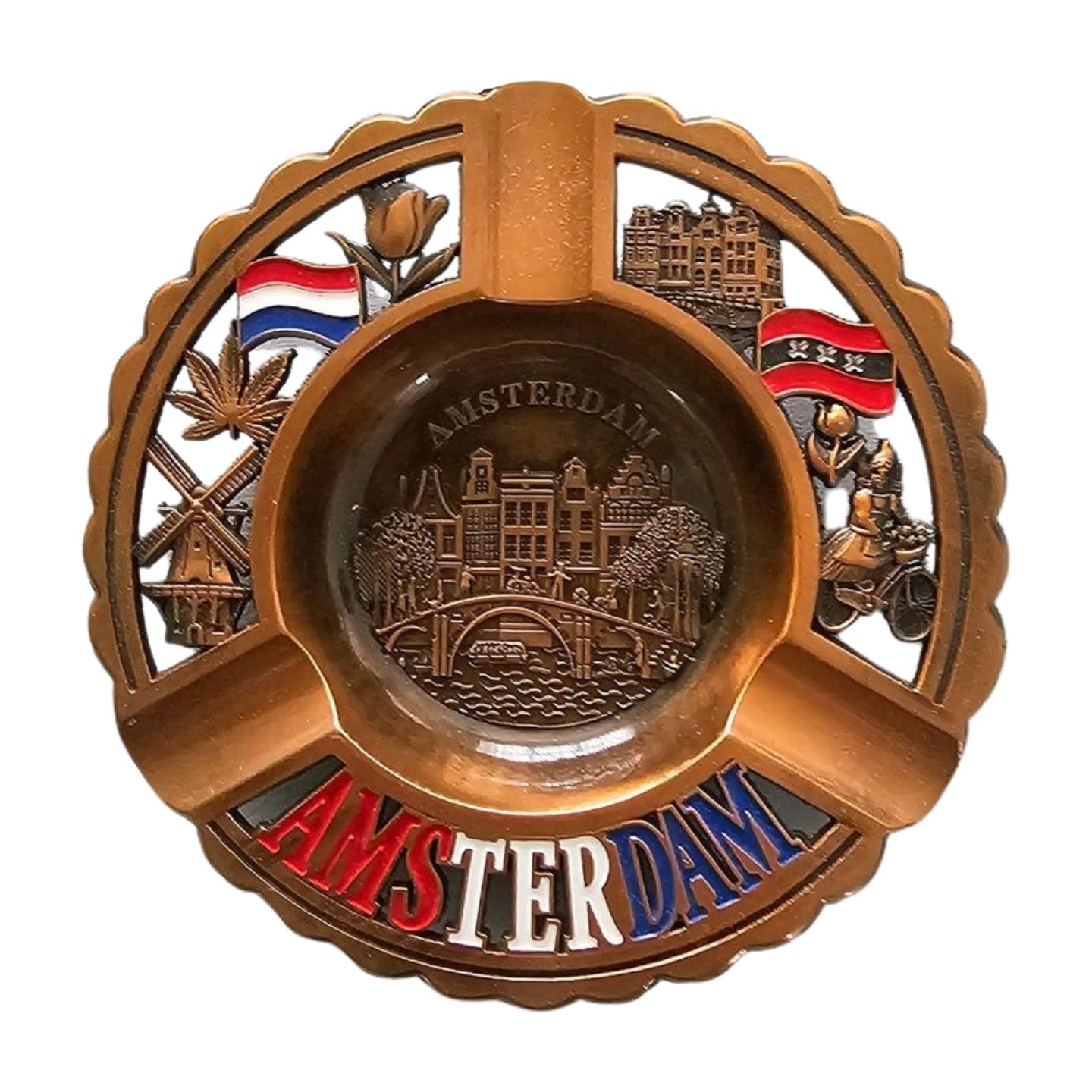 Dieser Aschenbecher hat eine runde Form und ist mit Ikonen aus Holland und Amsterdam verziert.