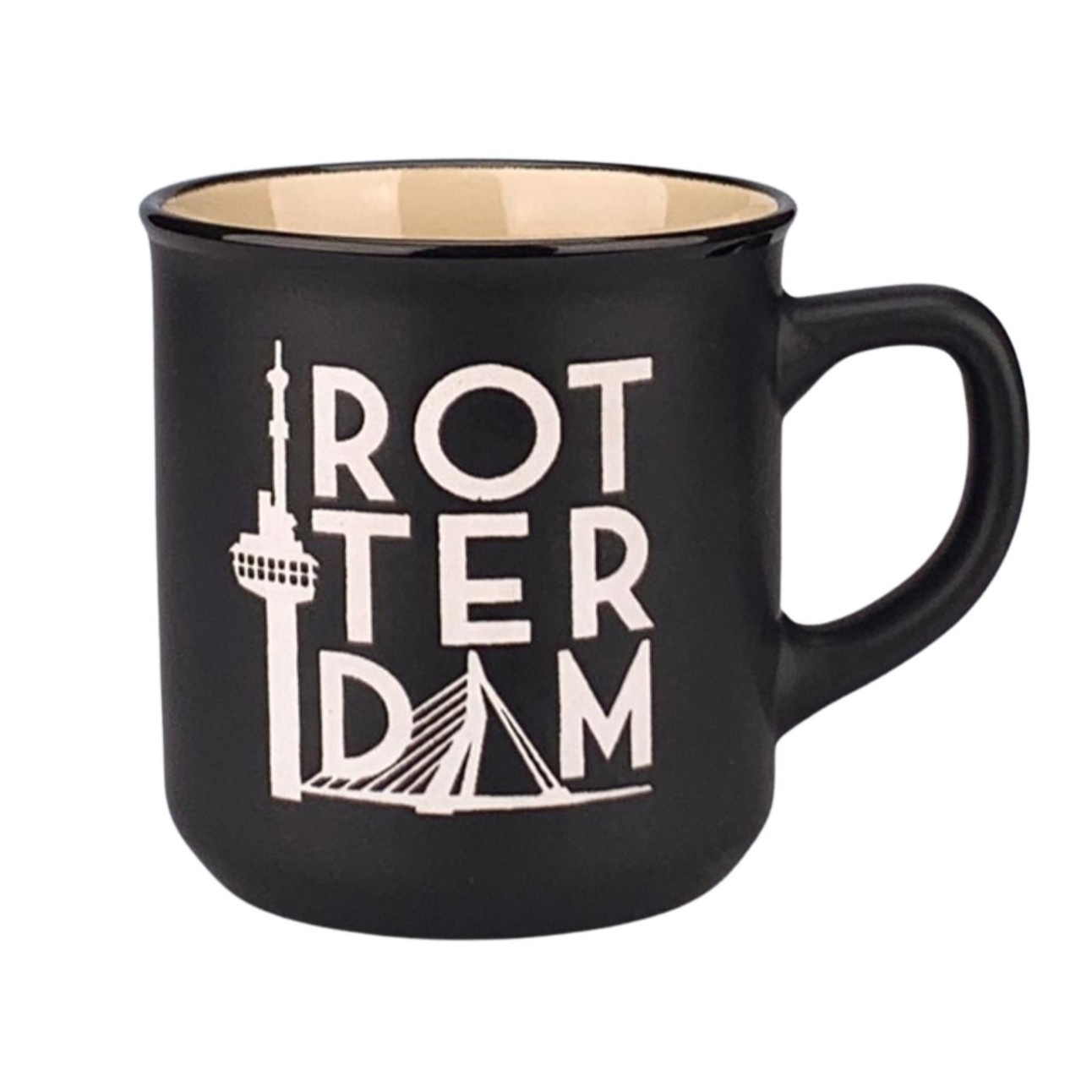 Kleiner Becher mit der Aufschrift „Erasmusbrücke Rotterdam“.Aus Keramik gefertigt