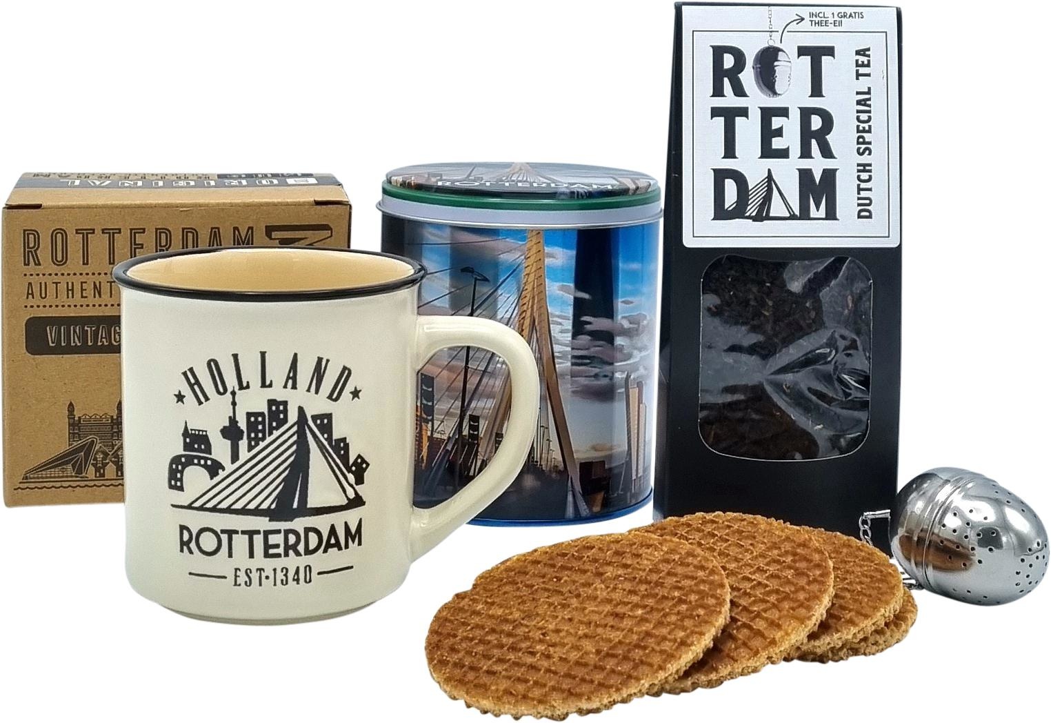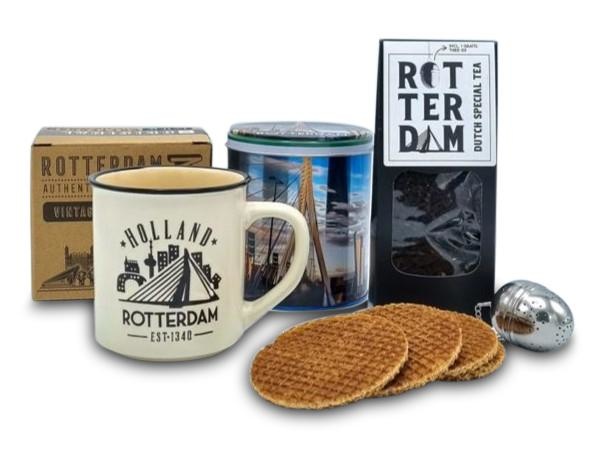 Super stabiler Becher - Erasmusbrücke Rotterdam (und andere coole Sehenswürdigkeiten) Wird als Geschenkset mit einer hübschen Dose Stroopwafels, Tee und einem praktischen Tee-Ei geliefert.