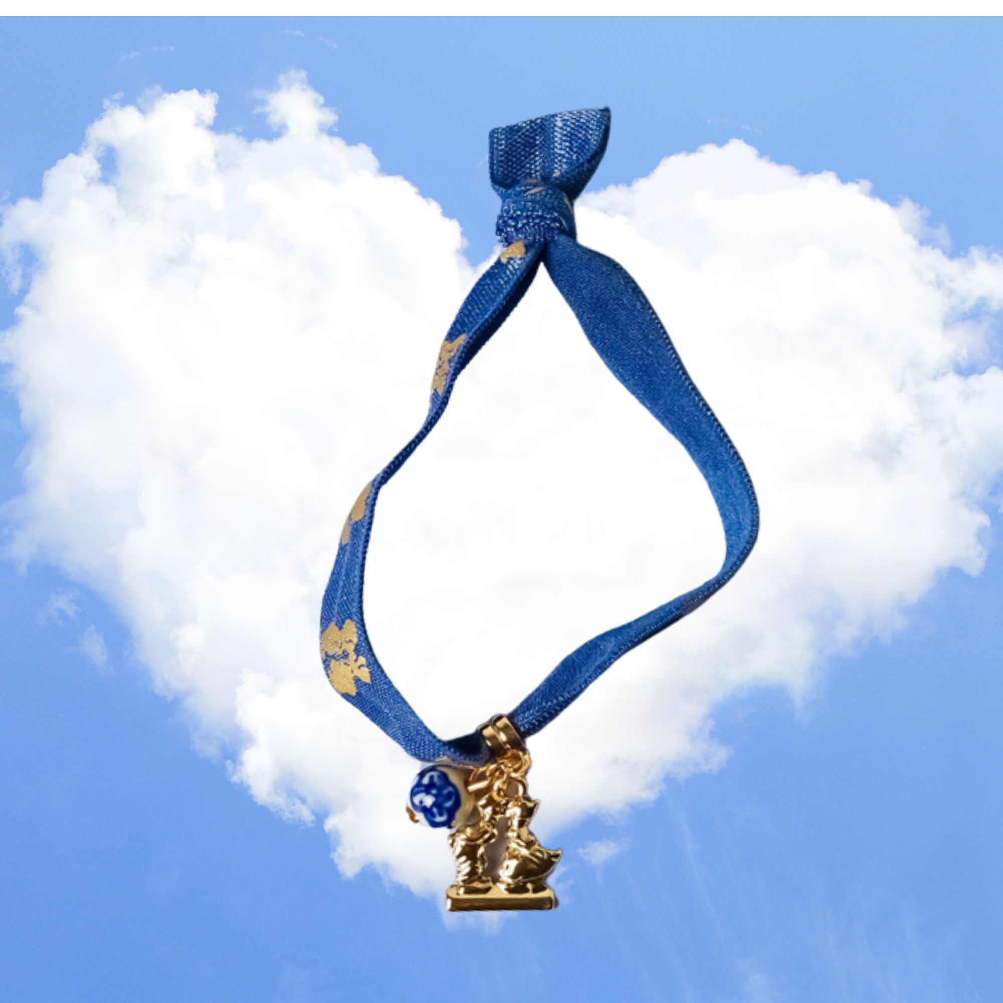 Auf dem Armband befindet sich ein goldfarbener Anhänger eines küssenden Paares,