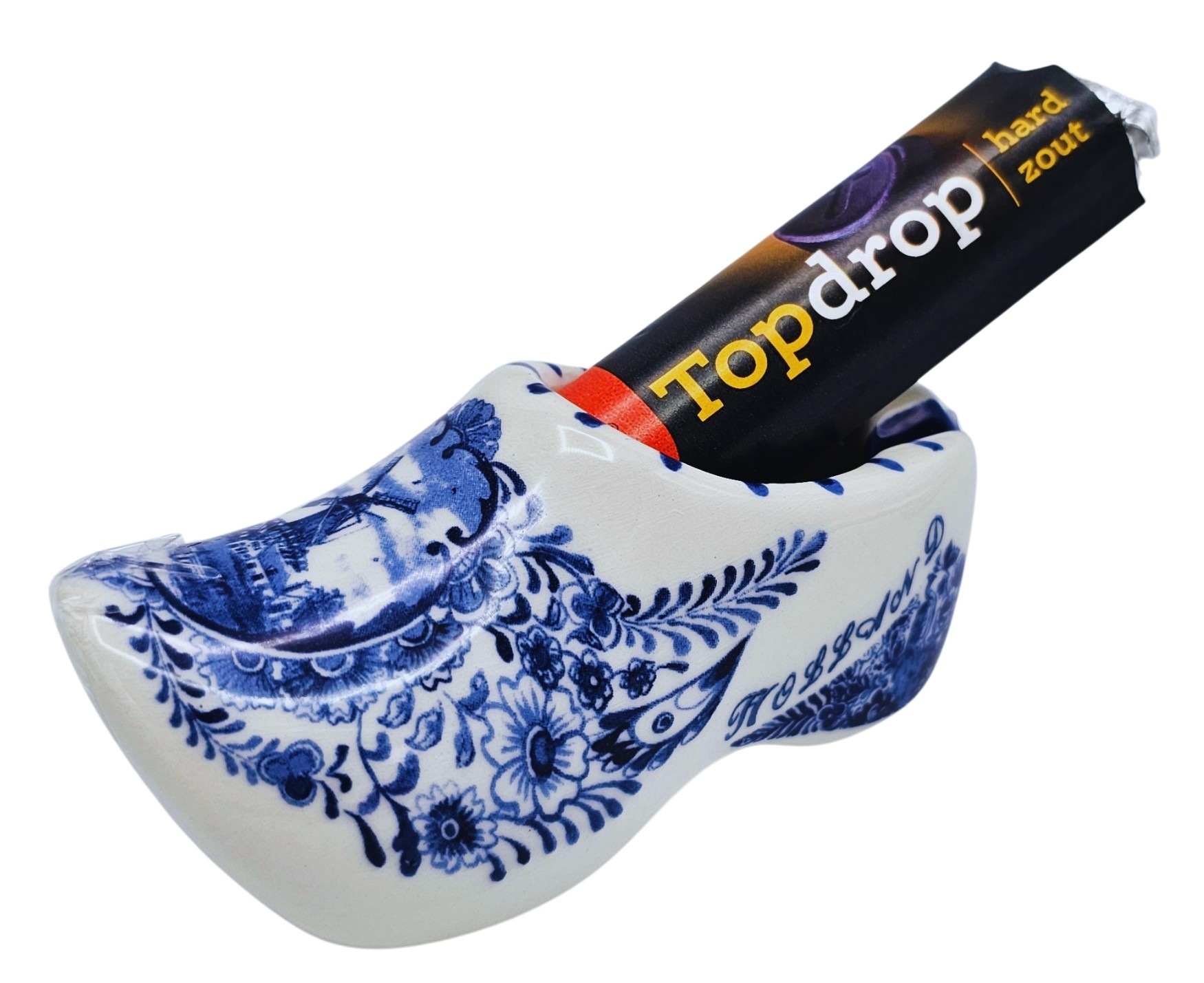Wunderschöner Delfter-Keramik-Holzschuh (10 cm) mit Windmühlenmotiv, gefüllt mit einer Rolle echter holländischer Lakritze. Ein luxuriöses Souvenir in einer stabilen Geschenkverpackung mit holländischer Schleife. Das perfekte Andenken für jeden Lakritzlie