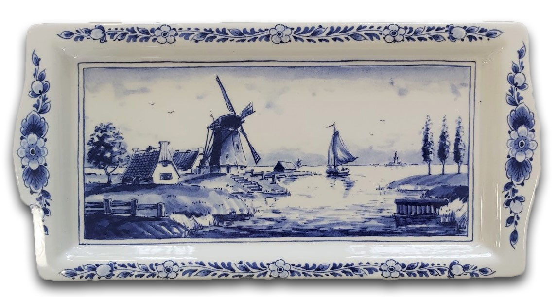 Delfter blaue Kuchenform mit einer detaillierten Windmühlenlandschaft