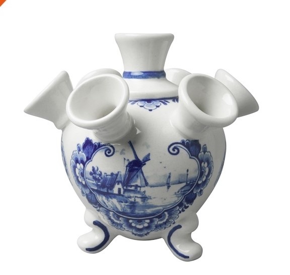 Diese tulpenförmige Vase in Delfter Blau ist mit einer holländischen Windmühlenlandschaft verziert.
