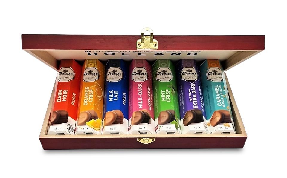 Stilvolle Geschenkbox gefüllt mit 7 Rollen Droste Pastillen. Die letzte Chance, diese köstliche Droste Schokolade zu genießen. 7 Rollen in verschiedenen Geschmacksrichtungen in einer schönen Geschenkbox. Aber dann haben Sie natürlich lange Freude daran.