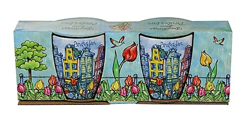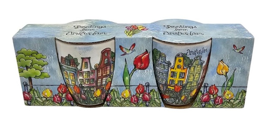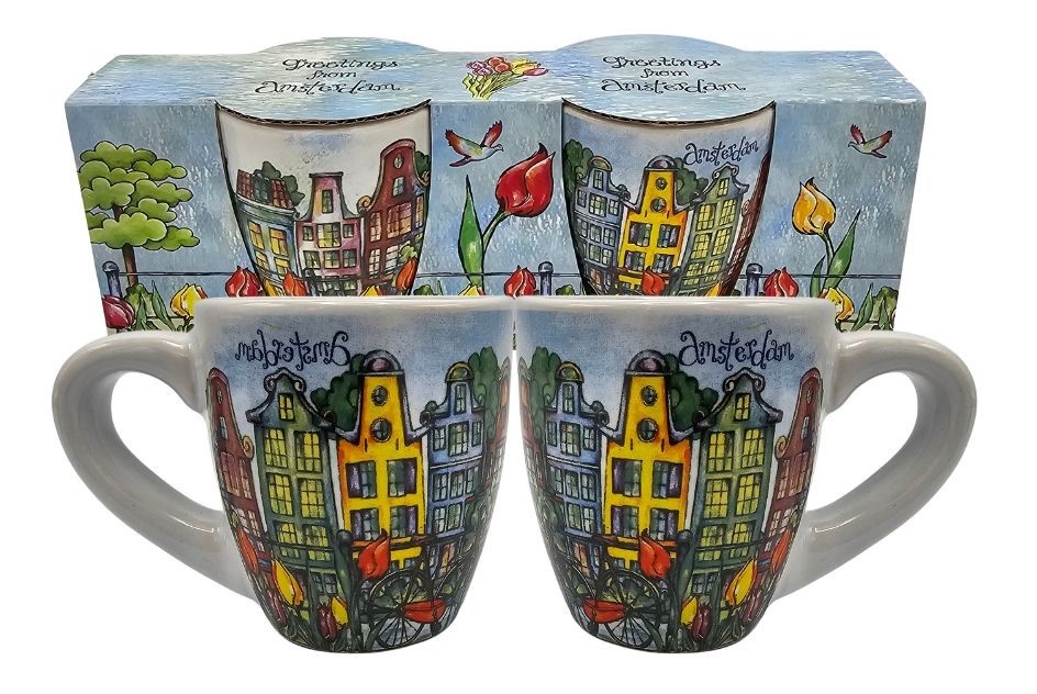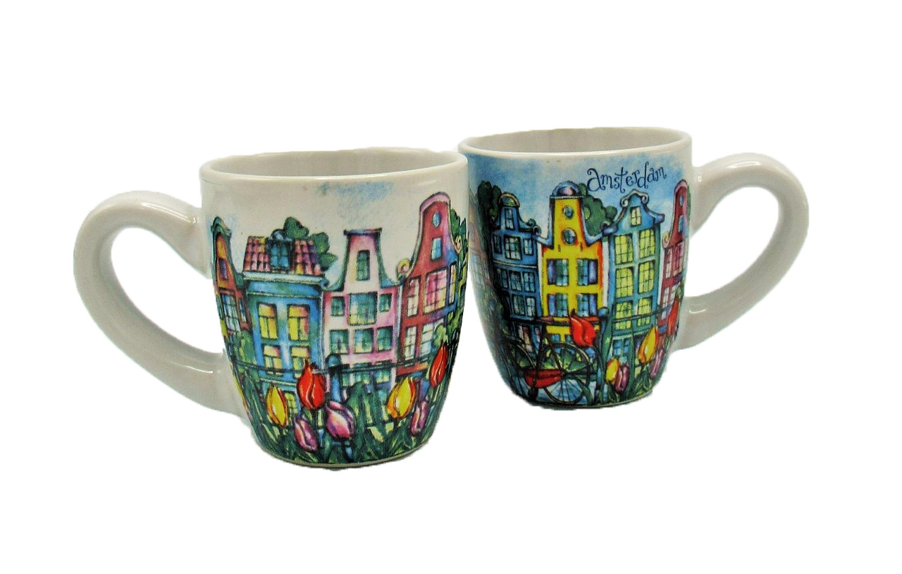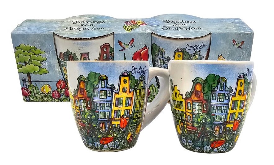 Schönes Geschenkset mit 2 Amsterdam Espressotassen mit Henkel.Dekoriert mit Amsterdamer Grachten – dünner Brücke und Fahrrad