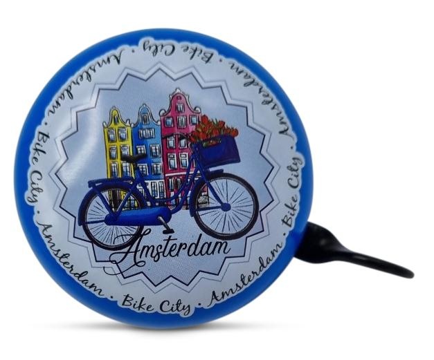 Typische niederländische Fahrradklingel mit Amsterdamer Häusern und Fahrrad