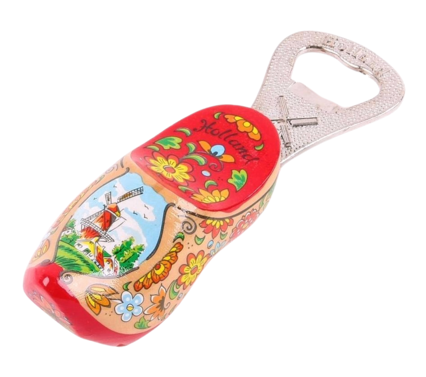 Flaschenöffner-Clog 8 cm – Blanko – Rote Sohle mit Windmühlen •Farbe: Blanko mit roter Sohle •Größe des Clogs: 8 cm •Größe insgesamt: 12 cm