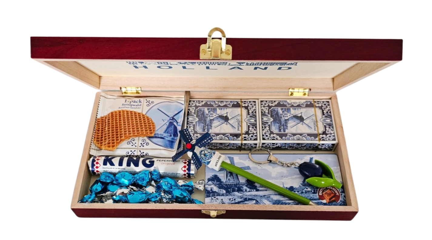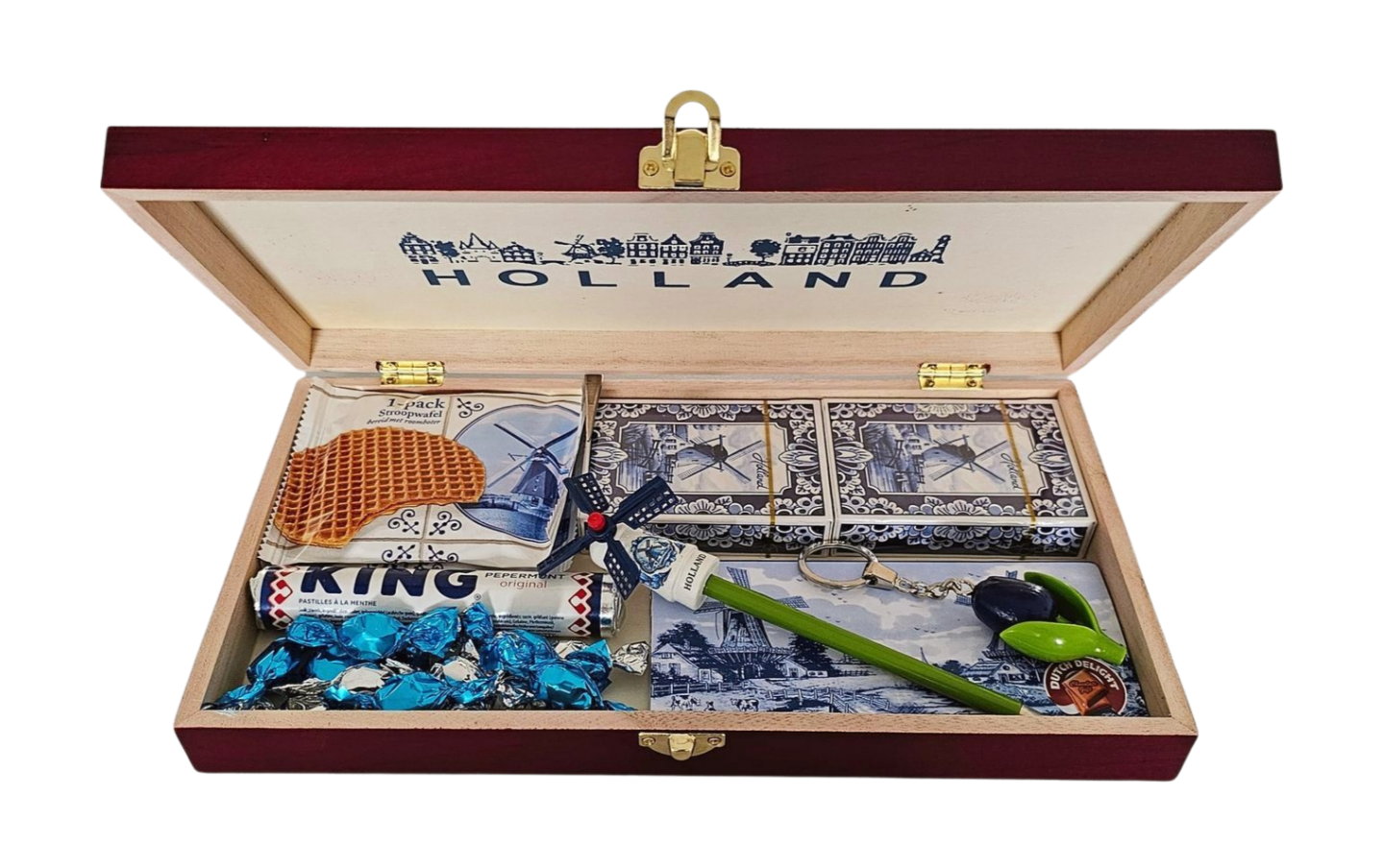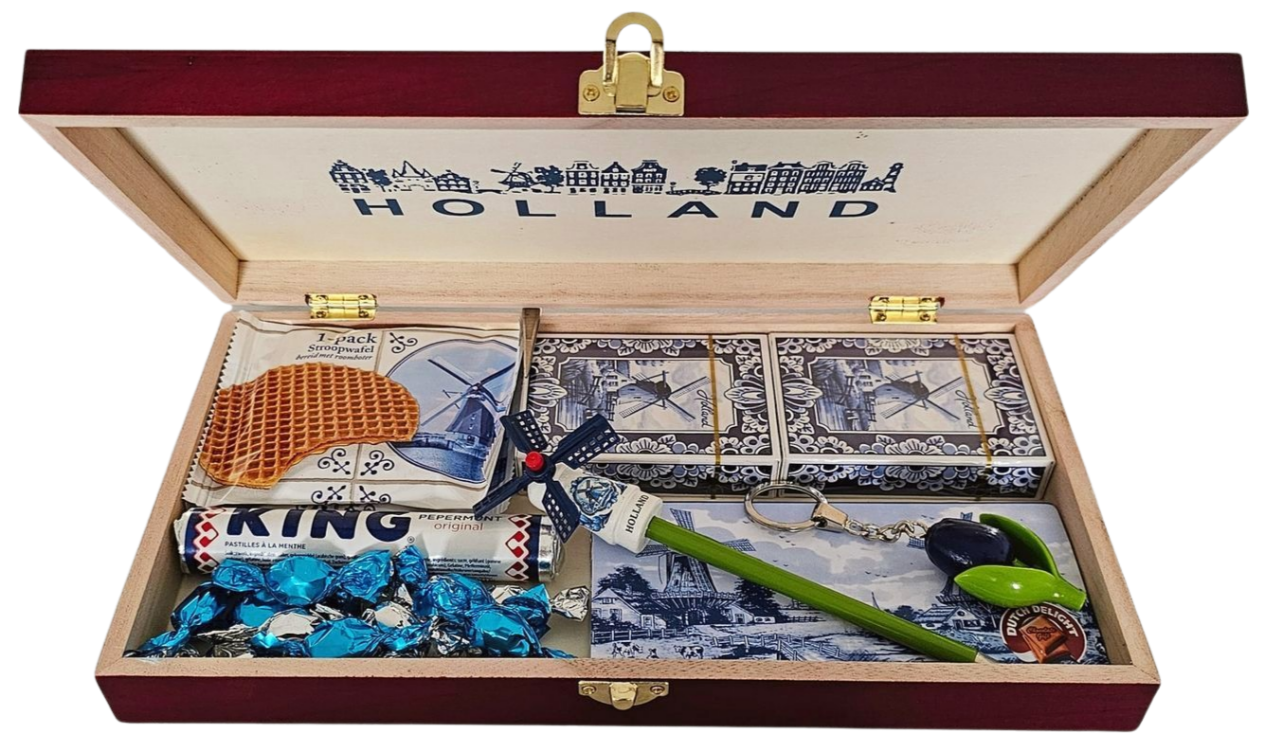 Eine fantastische Geschenkbox mit allem, wofür die Niederlande bekannt sind: Windmühlen, Sirupwaffeln, Tulpen und Delfter Keramik. Super originell! Dies ist die neueste Version unseres bestehenden Modells.