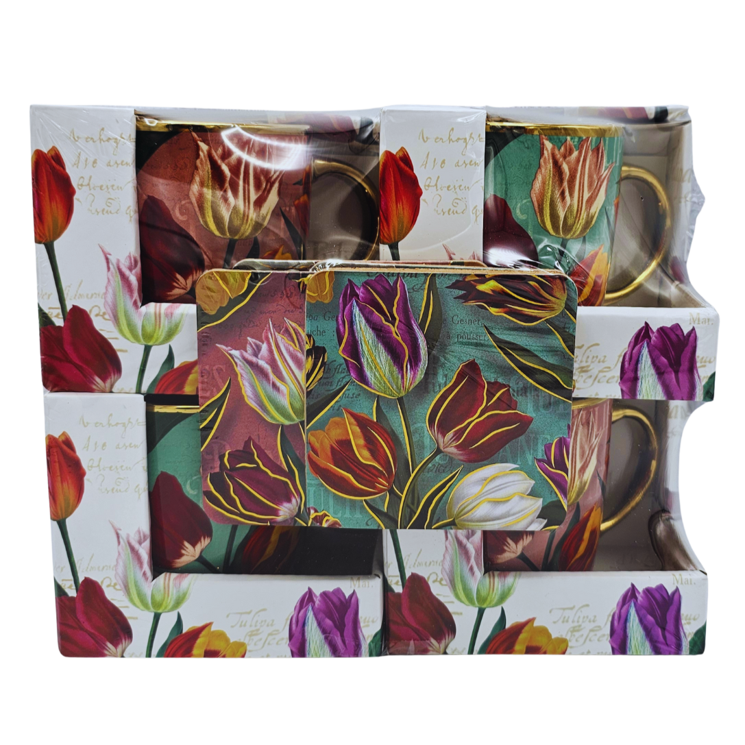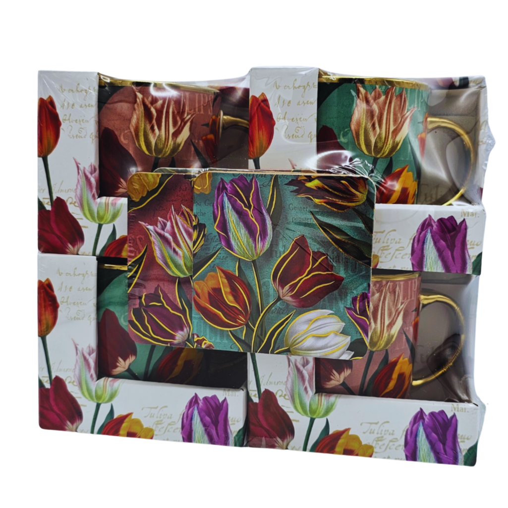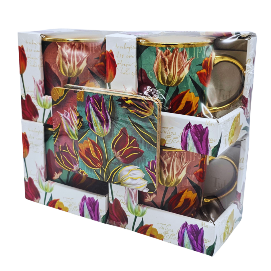 Geschenkbox mit 4 kleinen Tassen – Hübsche Tulpen mit kostenlosen Untersetzern