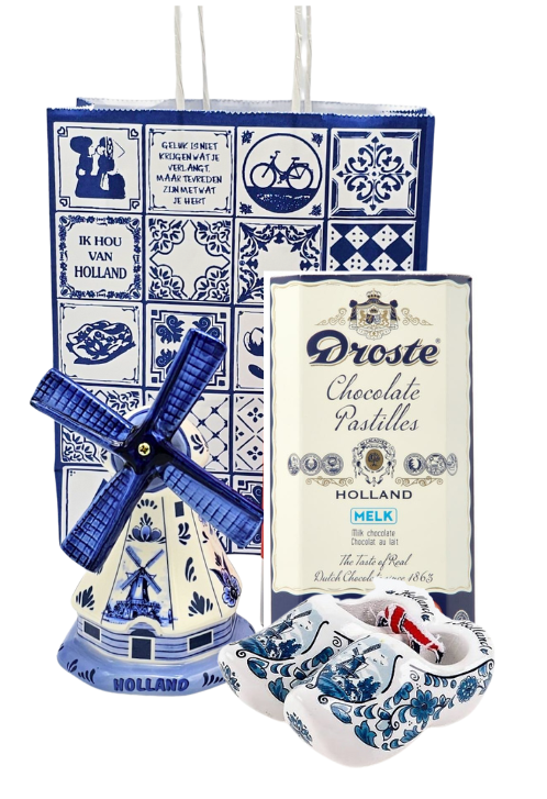 Geschenktüte - Typisch holländisch - Windmühle - Droste Schokolade und Holzschuhe. Wie praktisch! Ein fertiges Geschenk! Ideal als Reisegeschenk, als Werbegeschenk oder als Willkommensgeschenk. Eine wunderschöne Delfter blaue Windmühle und holländische Holzschuhe als Geschenk.