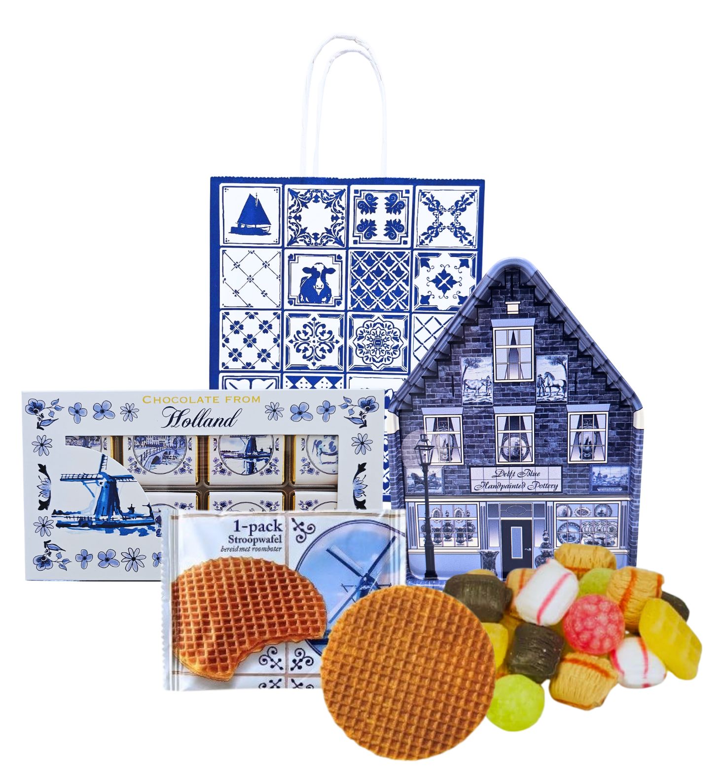 Geschenktüte – typisch holländisch – Blechdose (Hausform) – Sirupwaffel und Schokolade