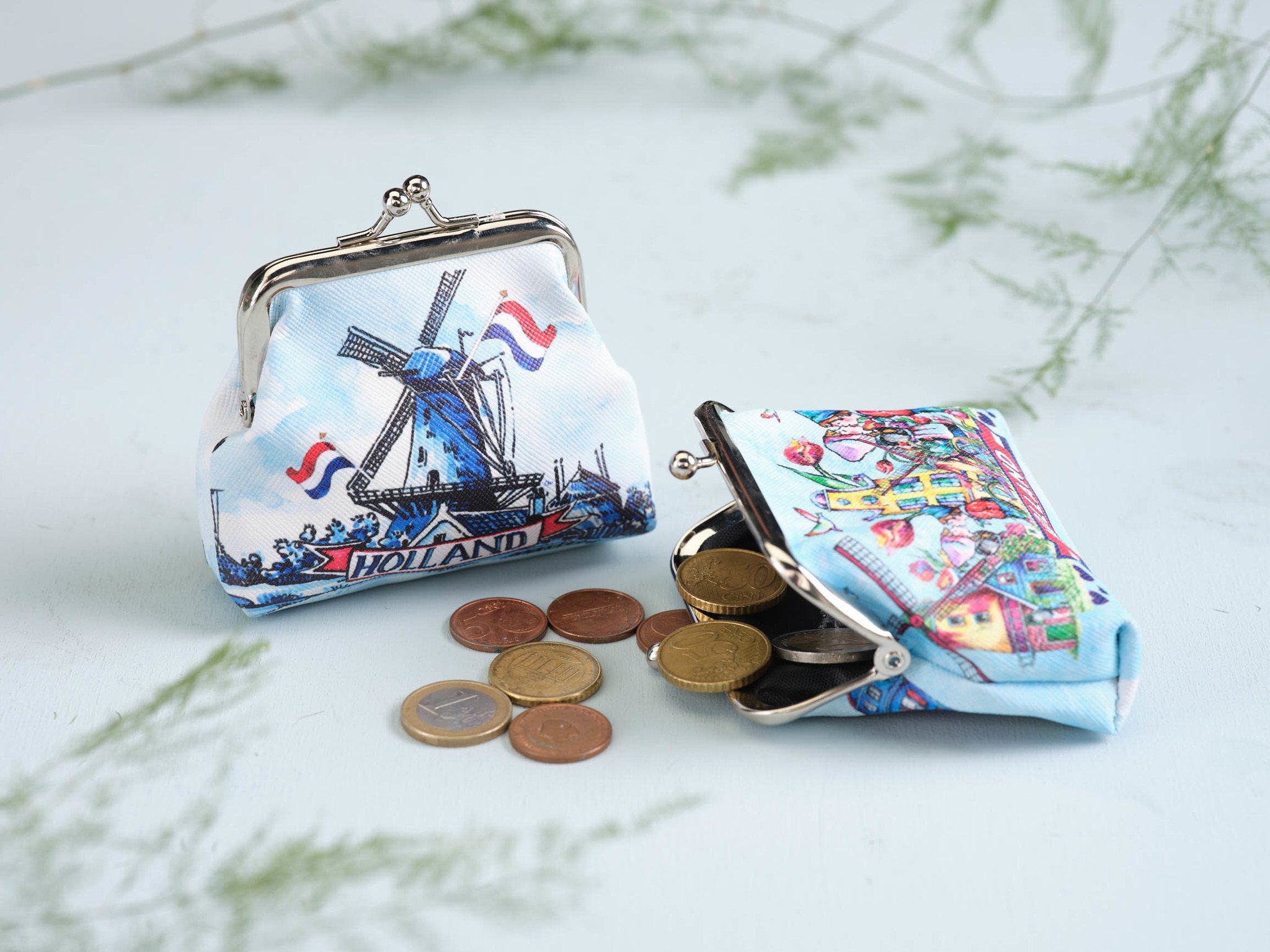 Möchten Sie eine Brieftasche von Typisch Hollands kaufen? Das hier ist hübsch, mit einer holländischen Windmühlenlandschaft. Wahnsinnig schöner Vintage-Druck. Abmessungen: 10 x 9,5 cm