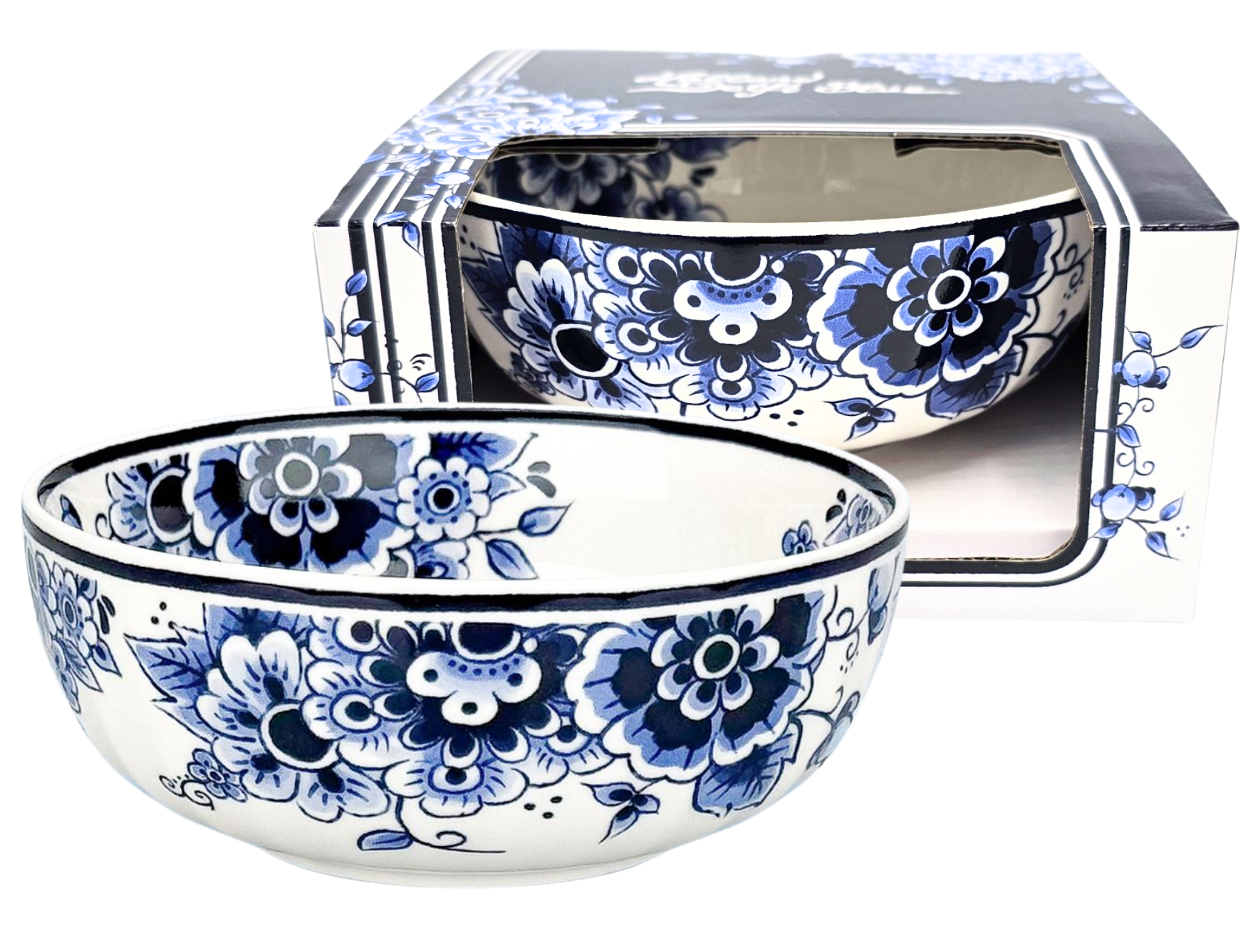 Diese große Schale mit klassischem Delfter Blau-Blumenmuster vereint zeitlose Eleganz mit moderner Funktionalität.