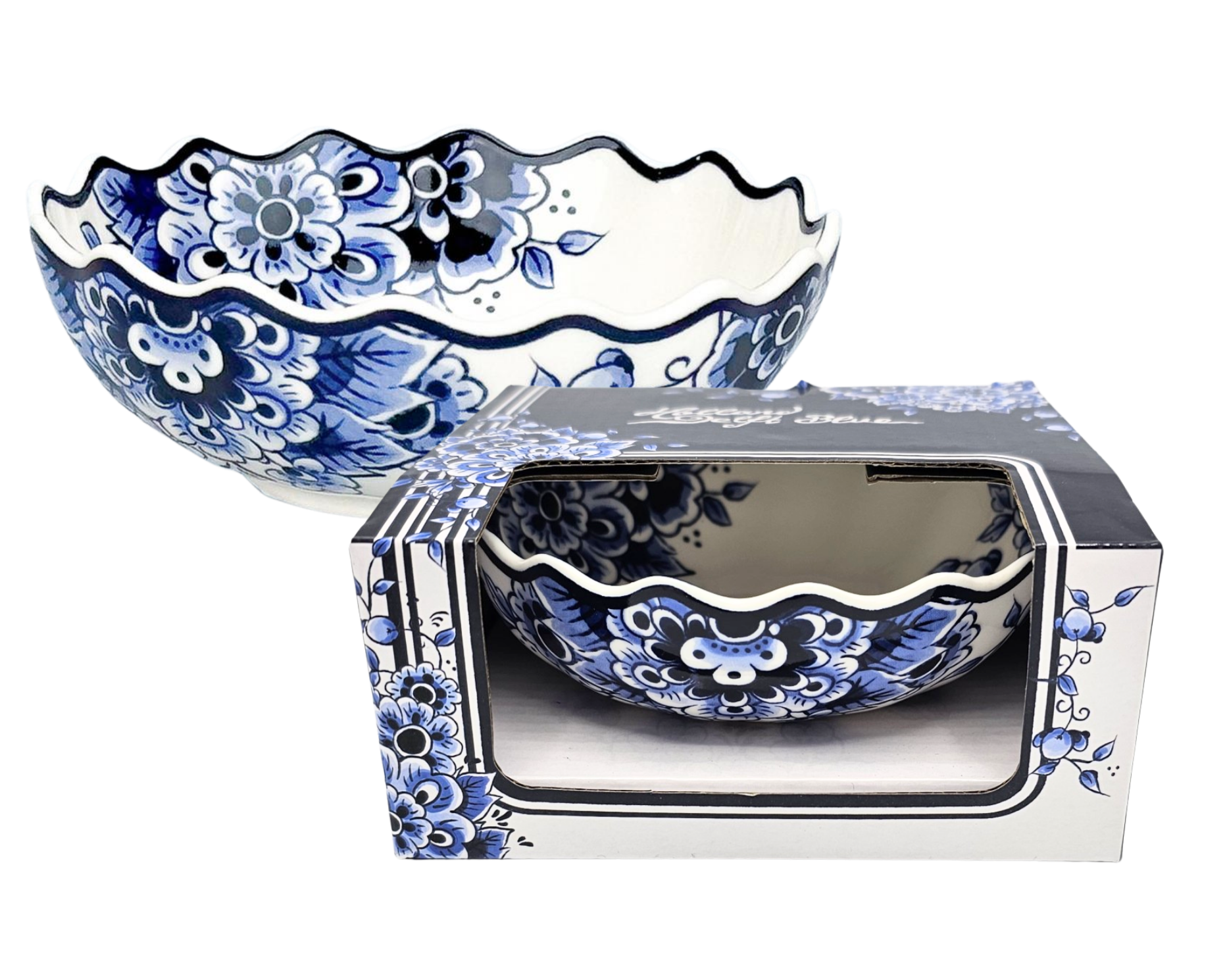 Eine wunderschöne Schale in Delfter Blau mit elegantem, gewelltem Rand und einem klassischen Blumenmotiv sowohl innen als auch außen.
