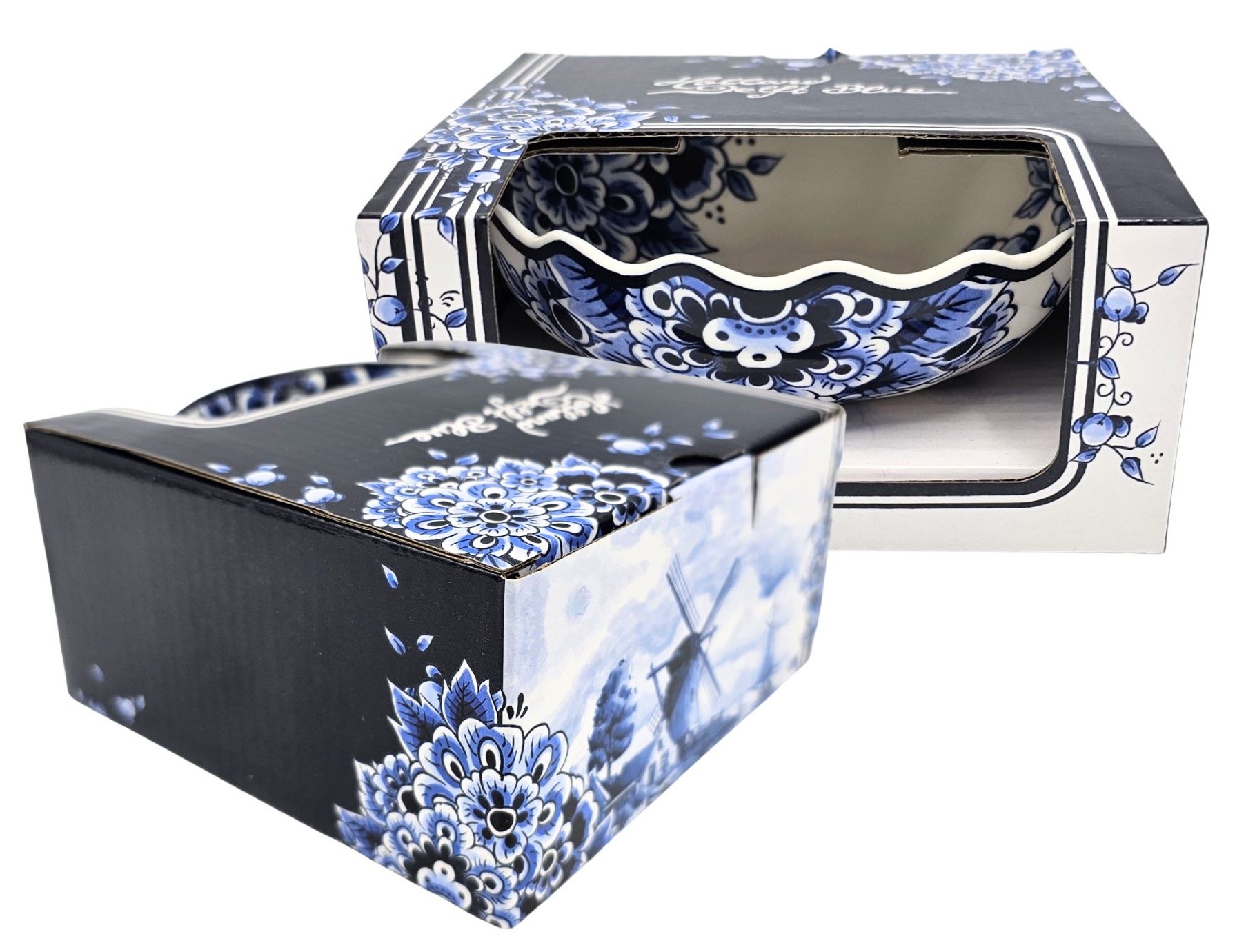 Eine wunderschöne Schale in Delfter Blau mit elegantem, geschwungenem Rand und einem klassischen Blumenmuster, das sowohl innen als auch außen angebracht ist. Ein raffiniertes Stück niederländischen Designs, das Tradition und Eleganz vereint.