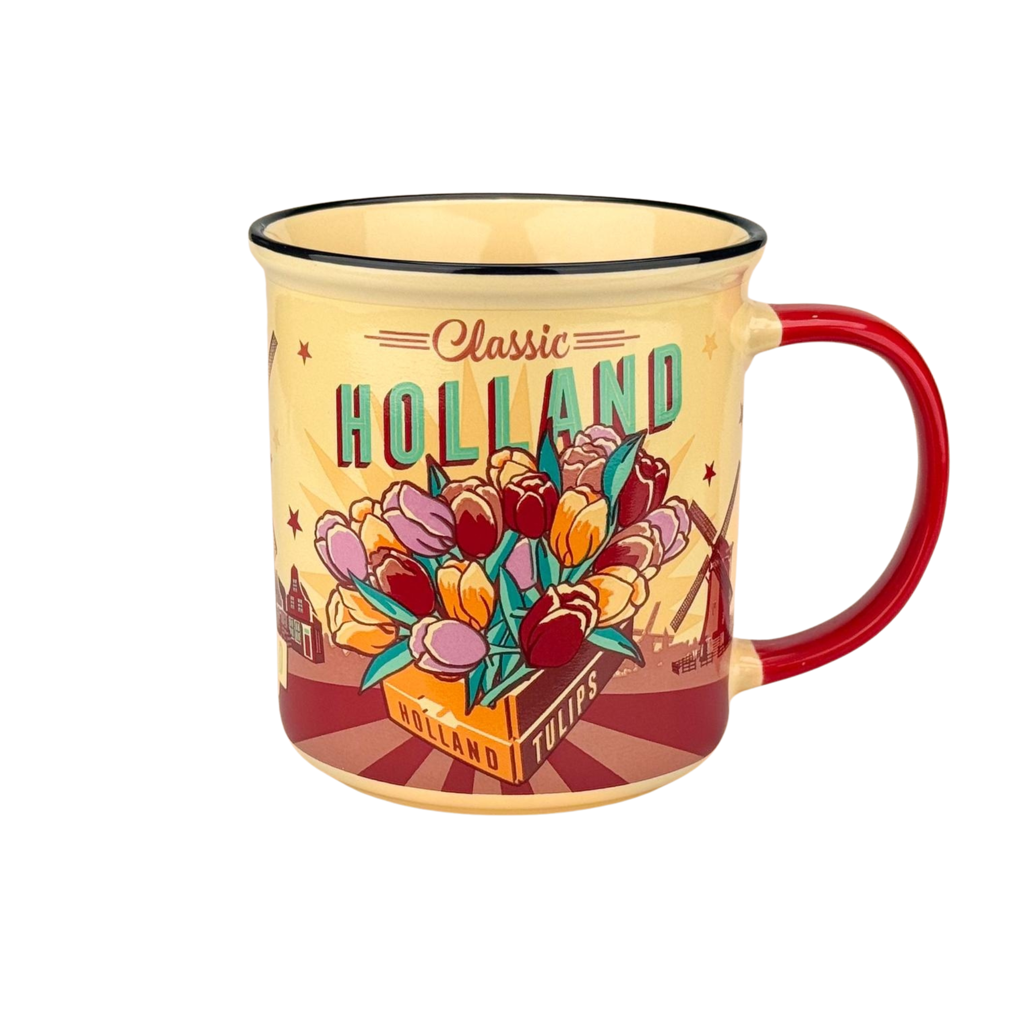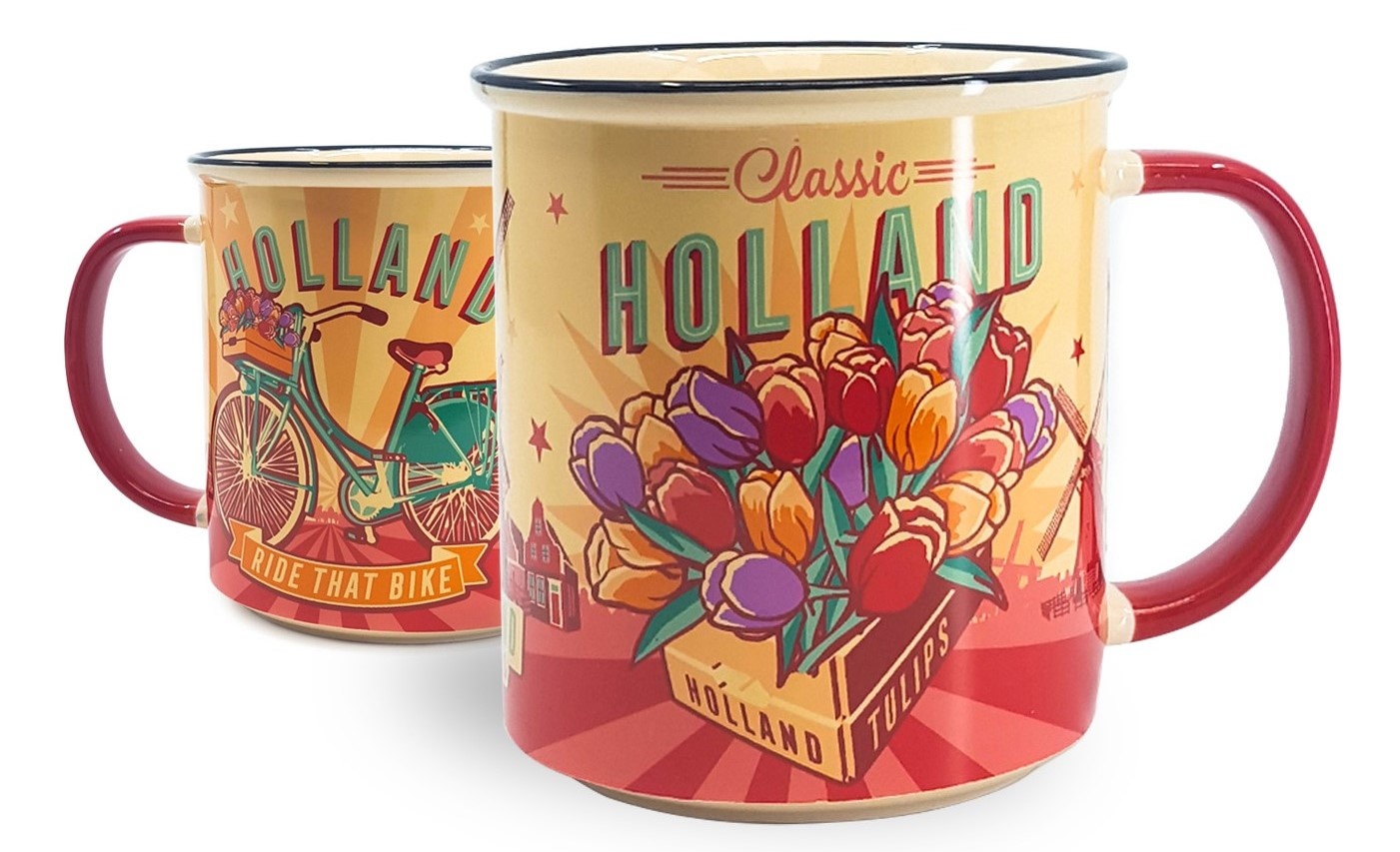 • Typisch Hollands Großer Becher in Geschenkbox – Vintage-Motiv: Tulpen und Fahrrad aus Holland