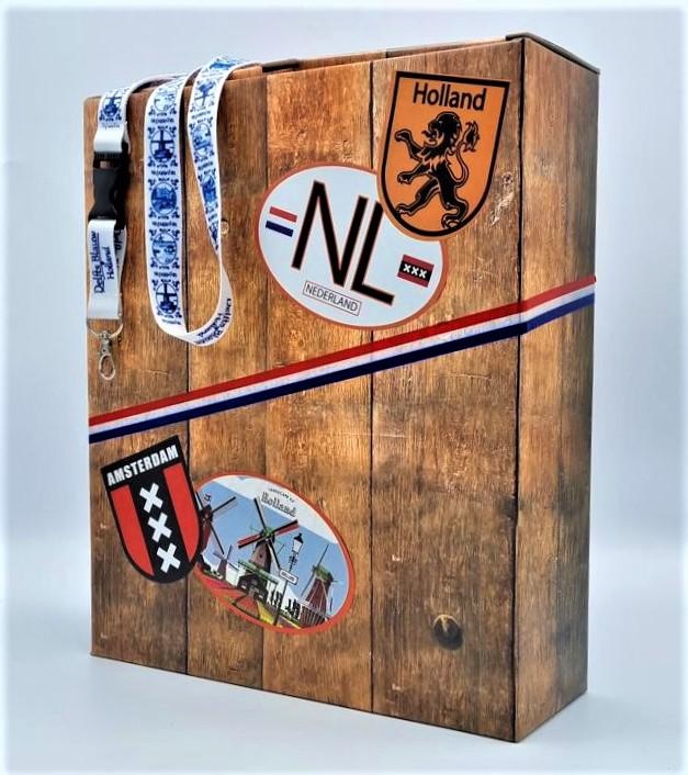 Eine schöne Box, 28x32 cm, aber stabile Box in Holzoptik mit einer Reihe von Köstlichkeiten, die beim Beschenkten wieder Heimweh nach den Niederlanden wecken werden.