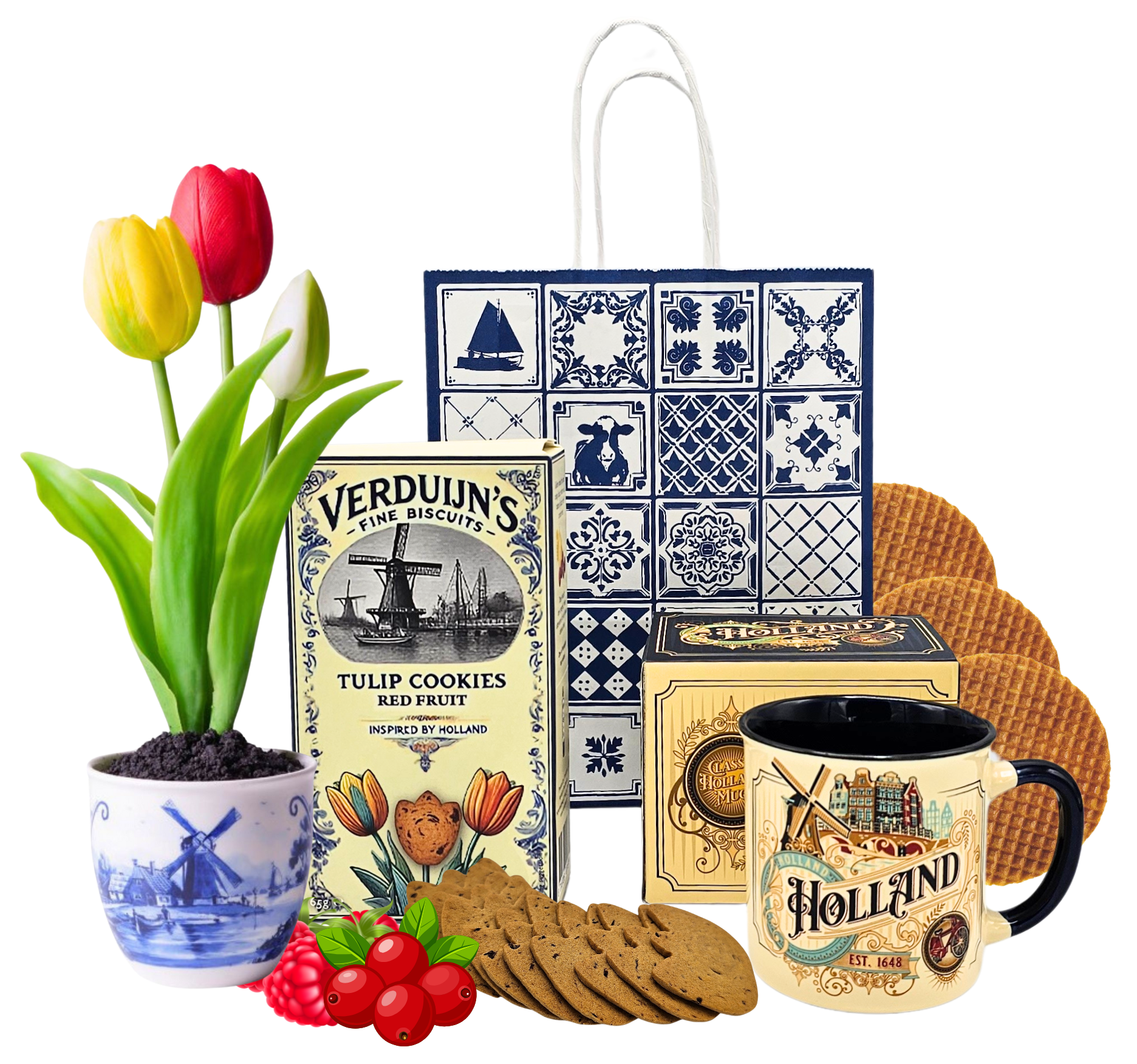 Suchen Sie nach einem Paket zum Verschenken mit verschiedenen niederländischen Geschenken? Holländische Köstlichkeiten - Goodie Bag mit Keksen, Tasse und Tulpen im Topf