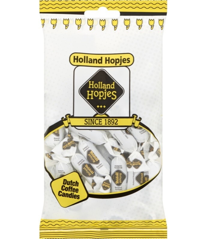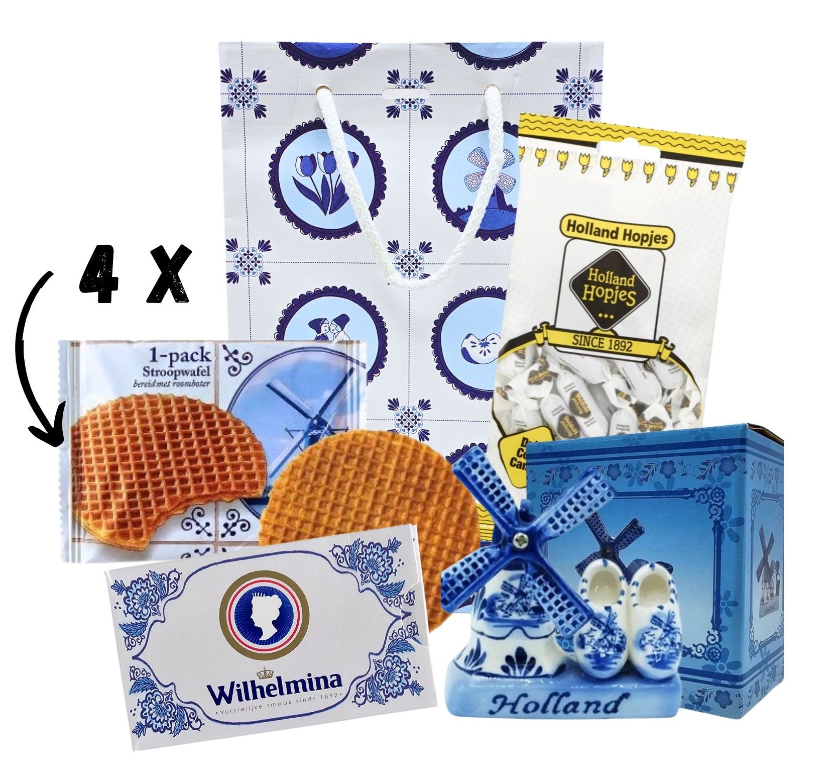 Suchen Sie einen Geschenkkorb mit einer Auswahl an holländischen Leckereien? Eine Geschenktüte mit Hopfen, Pfefferminzbonbons und einer Windmühle aus Delfter Blau.