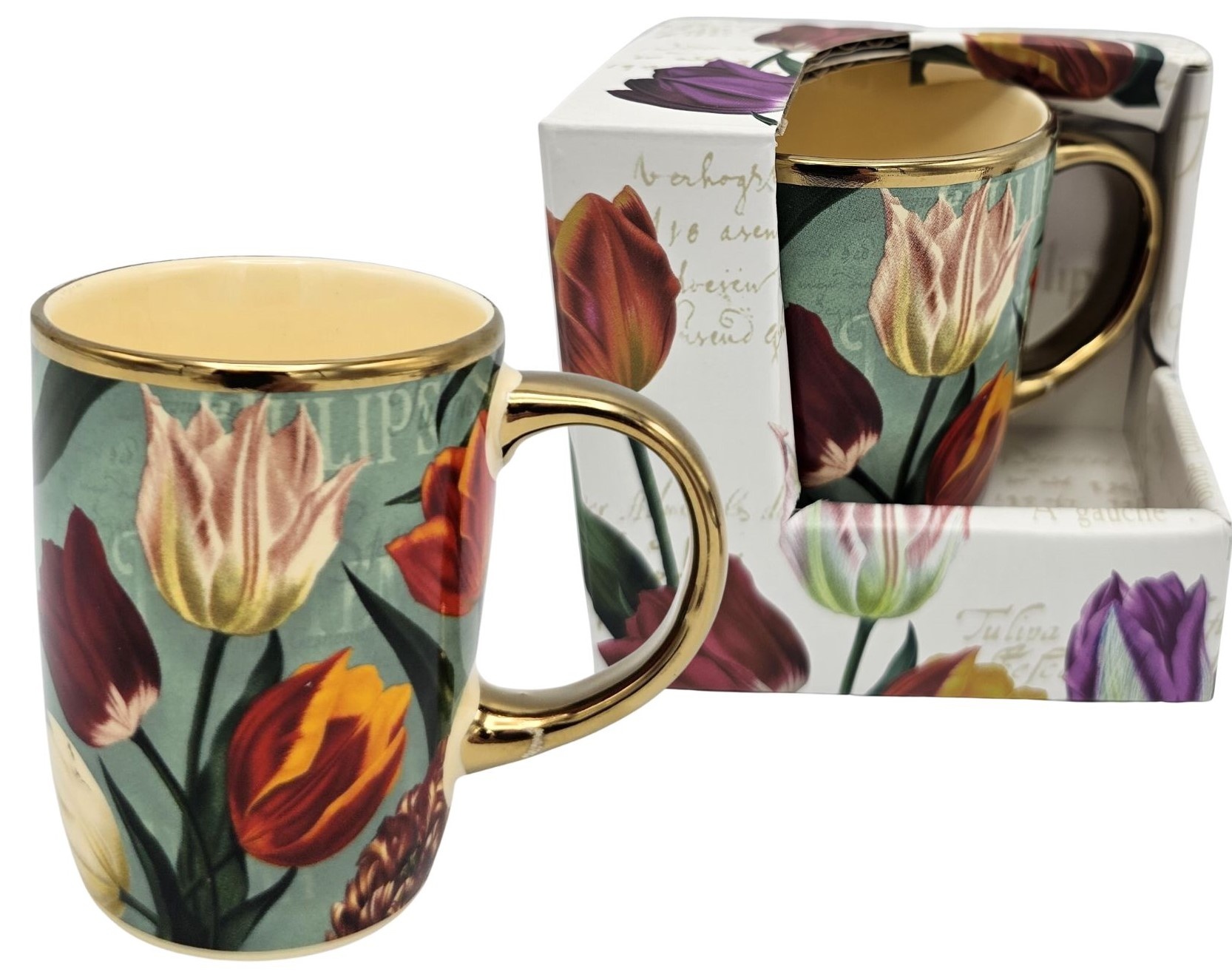 Stilvolles Tulpenmuster auf dem Becher und eine schöne Dose (der Becher wird außerdem in einer eleganten Schachtel geliefert).