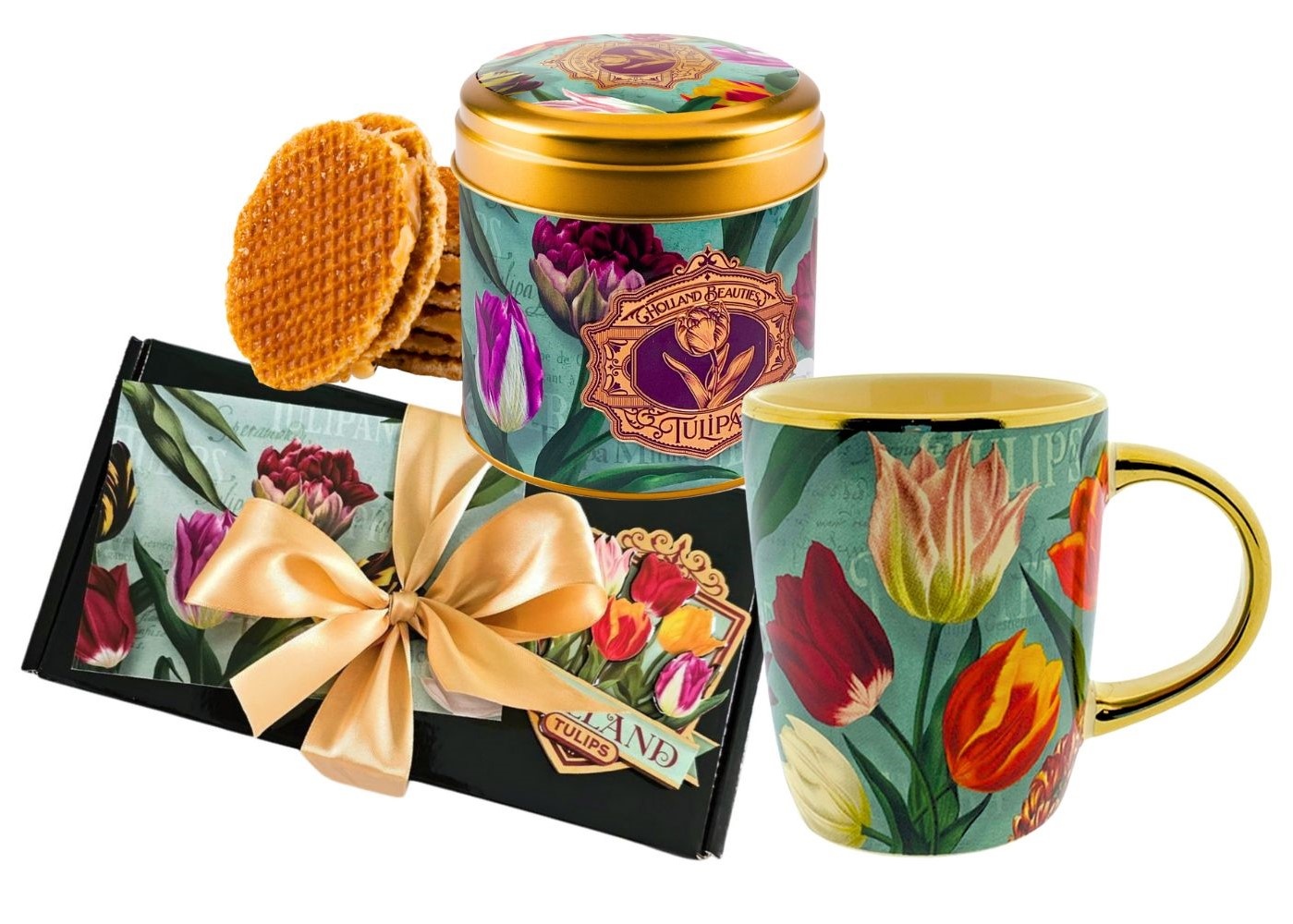 Holland-Geschenkset – Stroopwafel-Becher und -Dose – Hübsche Tulpen – Grün in edler Geschenkbox