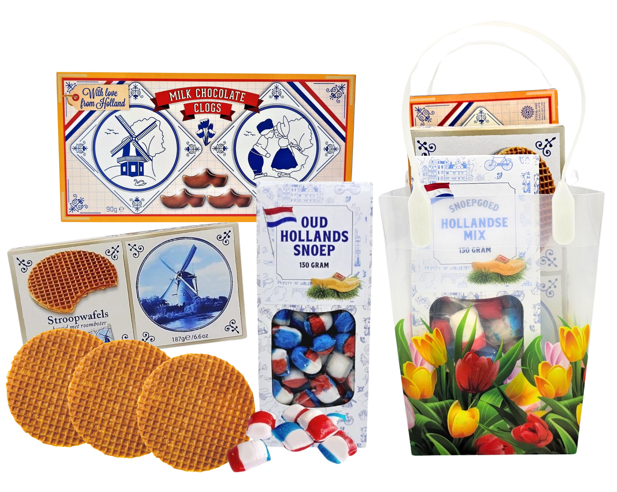 Überraschen Sie jemanden mit dieser fröhlichen Geschenktüte im holländischen Tulpen-Design. Gefüllt mit drei köstlichen Leckereien: Stroopwafeln, traditionellen holländischen Kissen und Schokoladenclogs. Eine kompakte und sofort einsatzbereite Geschenkver