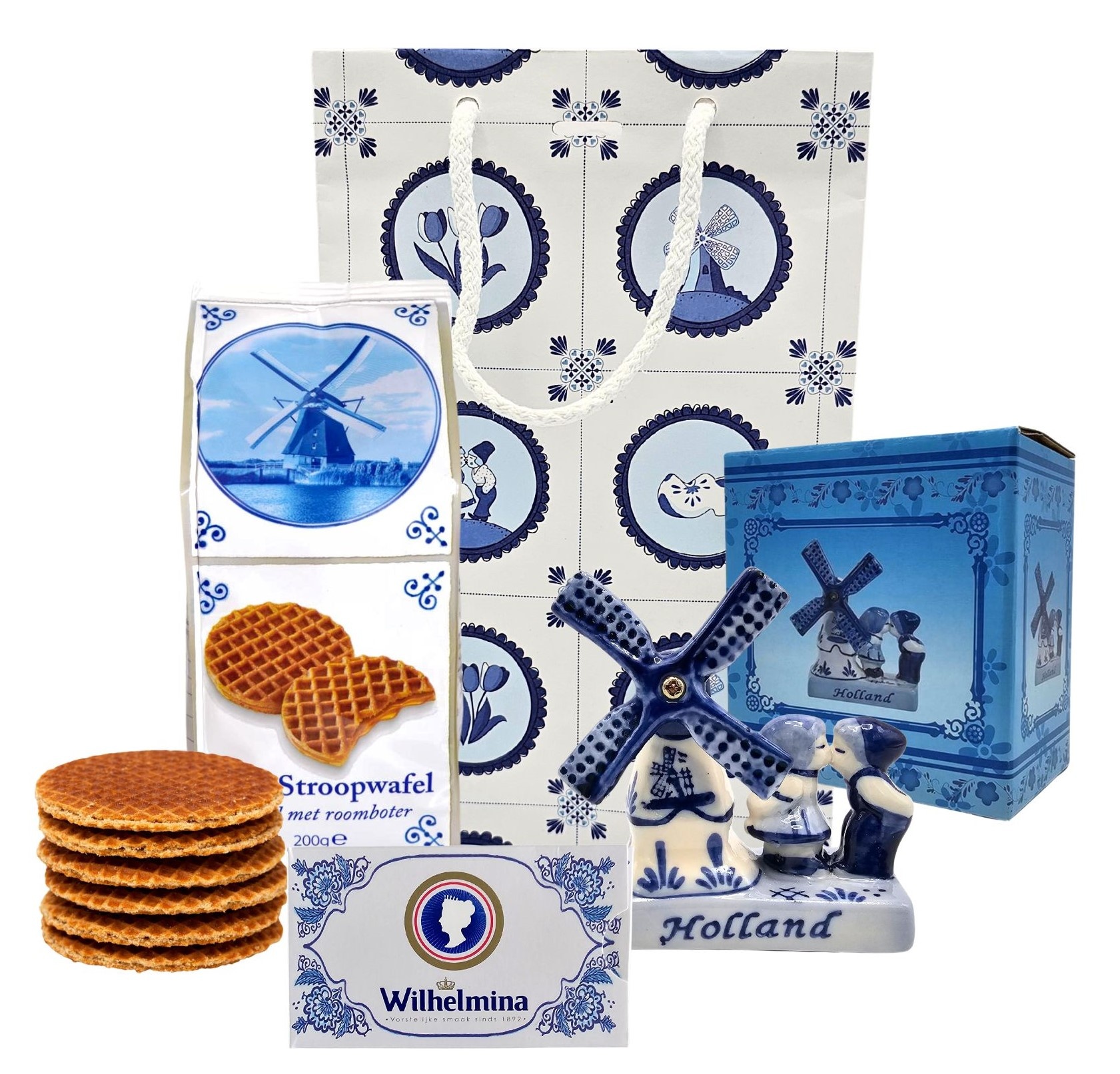 Delfter blaue Tüte mit einer typisch holländischen Windmühle – und etwas Leckerem.