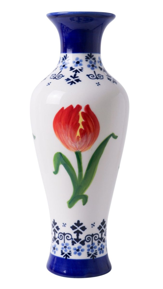 Schlanke Vase in Delfter Blau mit orangefarbenen Tulpen zum Arrangieren eines Blumenstraußes oder einfach als Prunkstück im Innenraum.