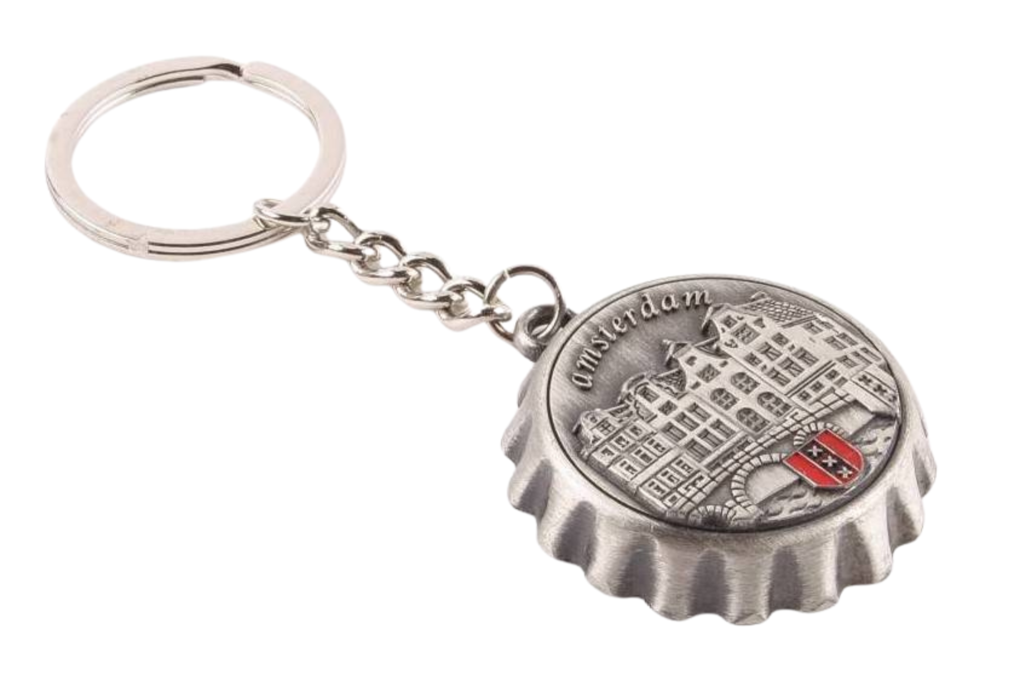 Dieser flaschenverschlussförmige Schlüsselanhänger ist raffiniert mit Amsterdamer Grachtenhäusern verziert. Auf der Rückseite befindet sich ein praktischer Flaschenöffner, sodass man ihn immer griffbereit hat.