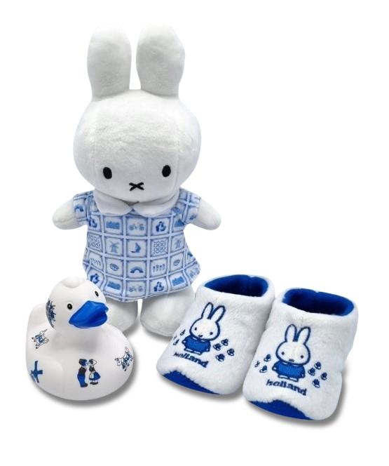 Miffy Geschenkset - Kuscheltier und Hausschuhe und Badeente Miffy trägt einen Holland-Pyjama und ist 24 cm groß. Die Hausschuhe sind in der Größe 0-6 Monate.Die Badeente ist Delfter Blau