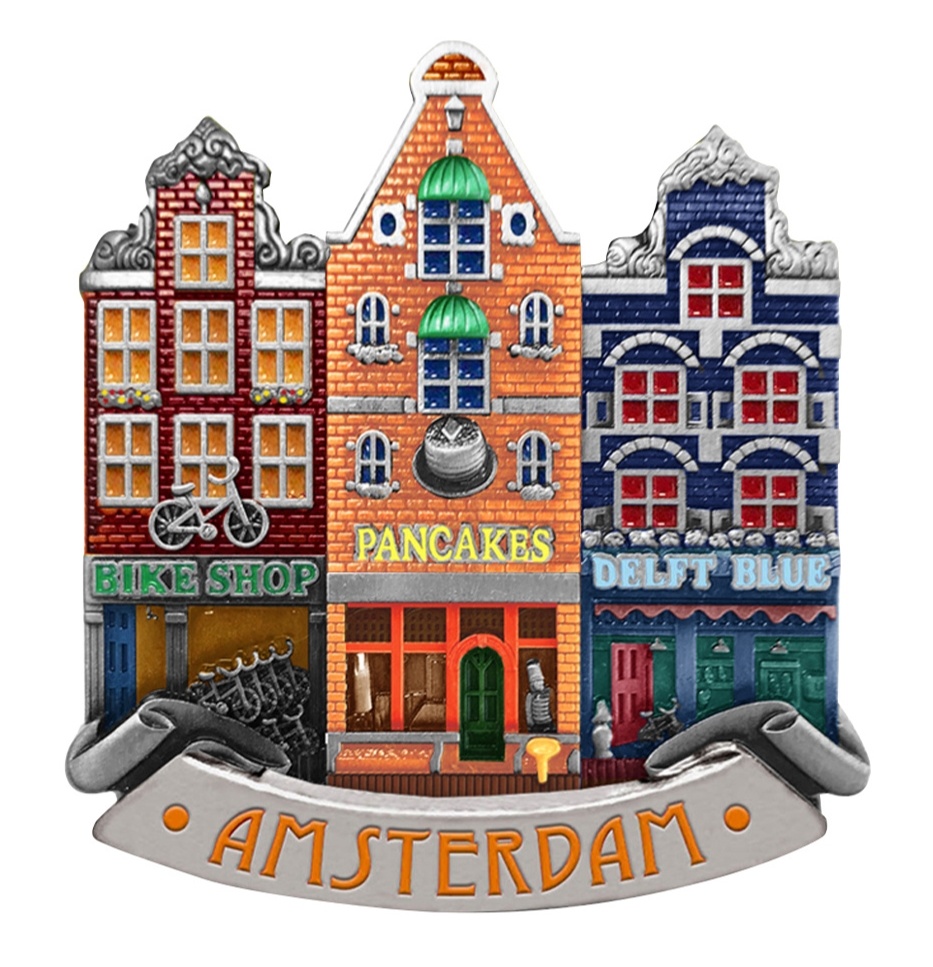 Bunter Magnet mit 3 Häusern in einer Reihe.