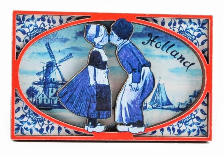 Küssendes Paar in einer typisch holländischen Wasser- und Windmühlenlandschaft