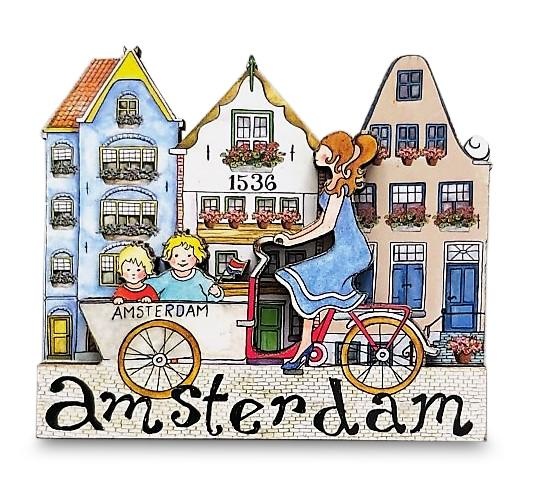 Magnetkanalhäuser - Dame auf dem (Fracht-) Fahrrad Magnet einer Reihe von Fassadenhäusern & Junge Dame auf dem Frachtfahrrad aus MDF Größe: 8x8cm