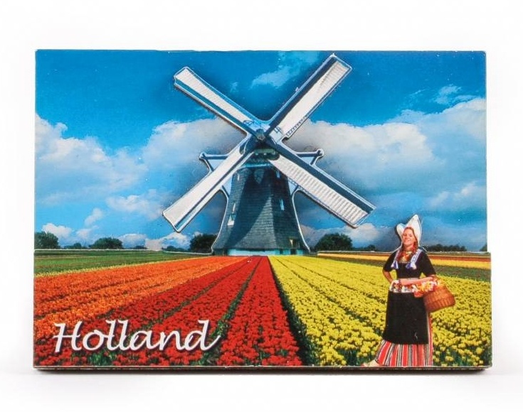 Souvenirmagnete kaufen? Das könnte eine nette Option sein. Windmühlenlandschaft und Tulpen als dekoratives Highlight