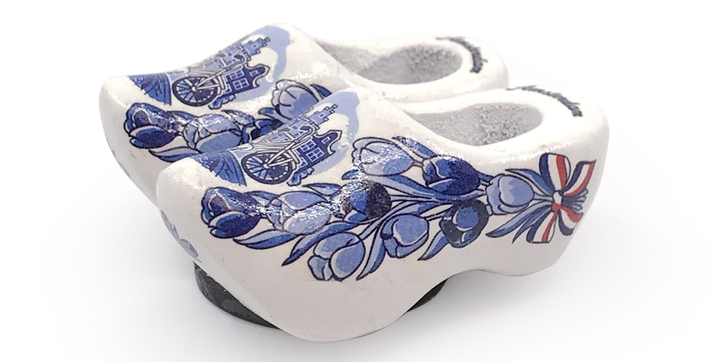 Verleihen Sie Ihrem Kühlschrank mit diesen magnetischen Holzclogs in Delfter Blau einen klassischen Look. Die Doppelclogs sind weiß mit blauen Verzierungen von Fahrrädern, Giebelhäusern und Tulpen. Ein zeitloses niederländisches Souvenir für Zuhause oder