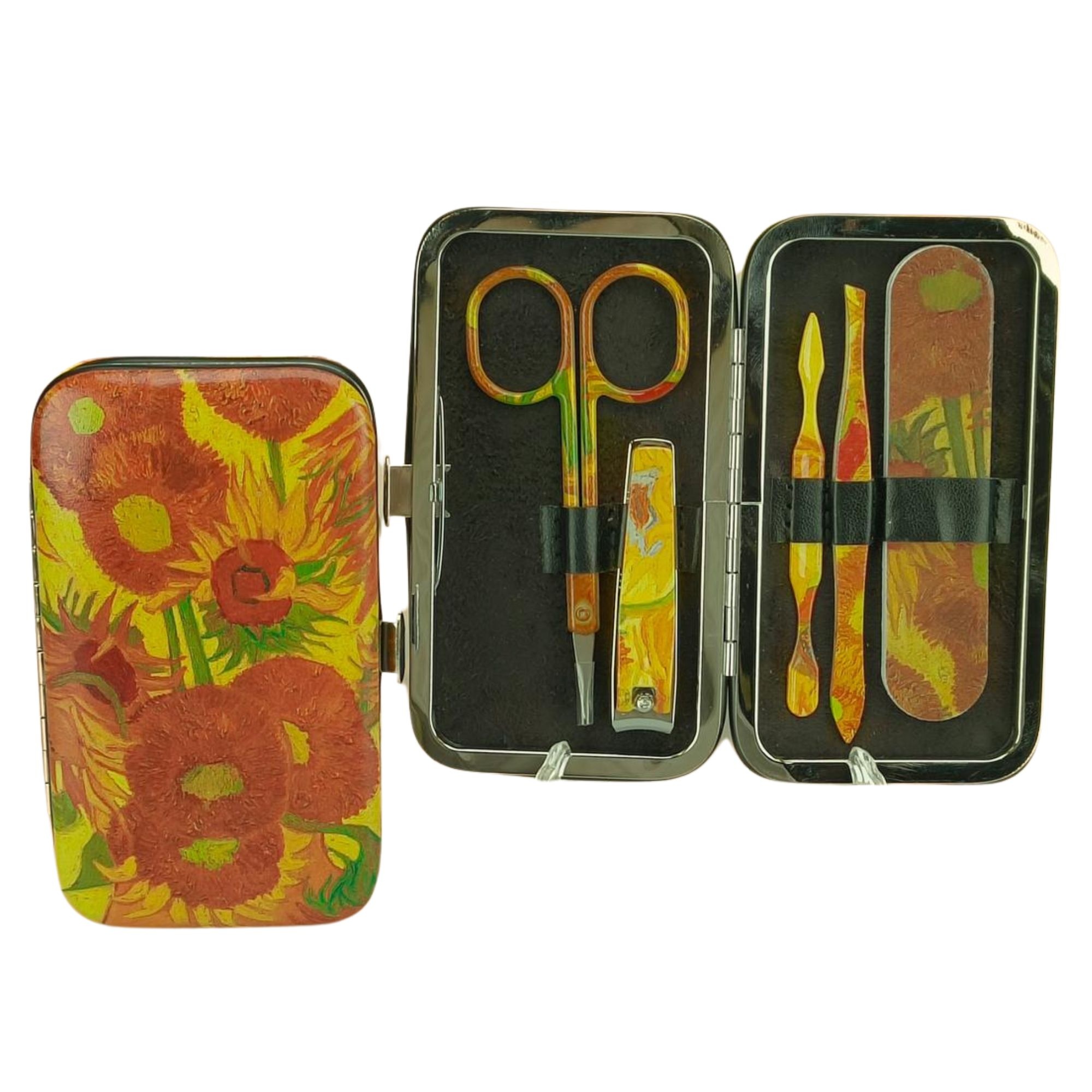 Ein 5-teiliges Maniküre-Set in einem mit Sonnenblumen verzierten Etui mit Clipverschluss.
