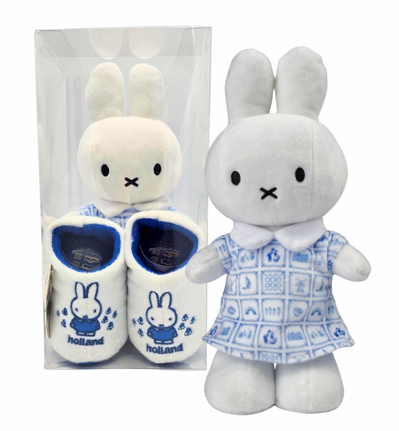 Miffy-Geschenkset - Kuscheltier und Hausschuhe - Blau Miffy trägt ein blaues Holland-Kleid. Dieses Miffy-Kuscheltier ist 24 cm groß. Die Hausschuhe haben die Größe 0-6 Monate