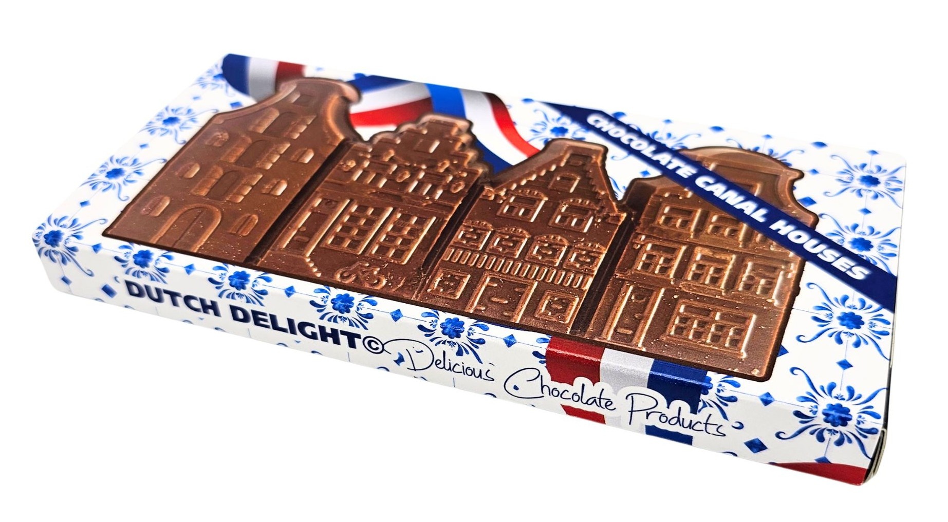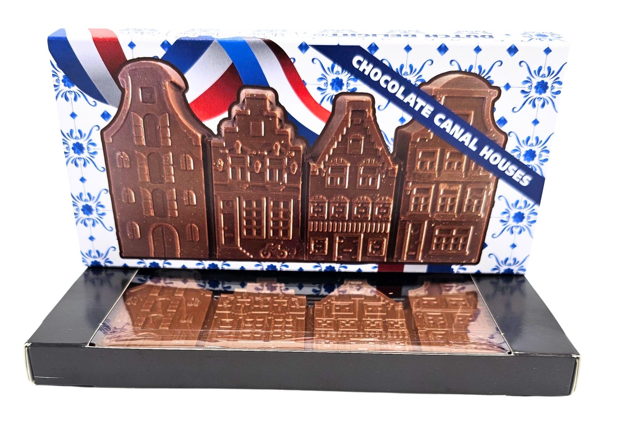 Entdecken Sie unsere wunderschönen Giebelhäuser aus Milchschokolade, sorgfältig verpackt in einer Delfter Blau-Geschenkbox.