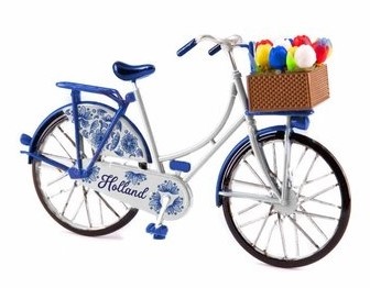 Miniaturfahrrad in Delfter Blau mit einer Kiste Tulpen.