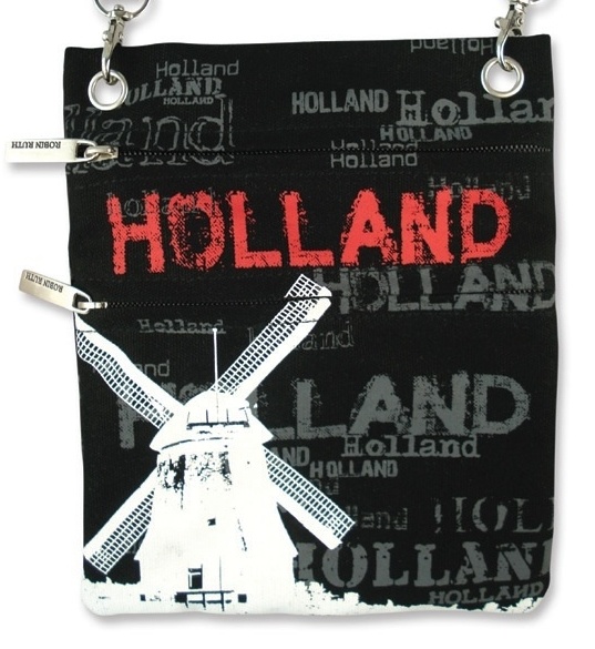 Halstasche - Passtasche - Holland Mill - Schwarz-Weiß-Rot Diese Tasche von Robin Ruth hat zwei Fächer mit Reißverschluss und verstellbarem Tragegurt. Sehr gut geeignet für Geld und Reisedokumente während Ihrer Reise.