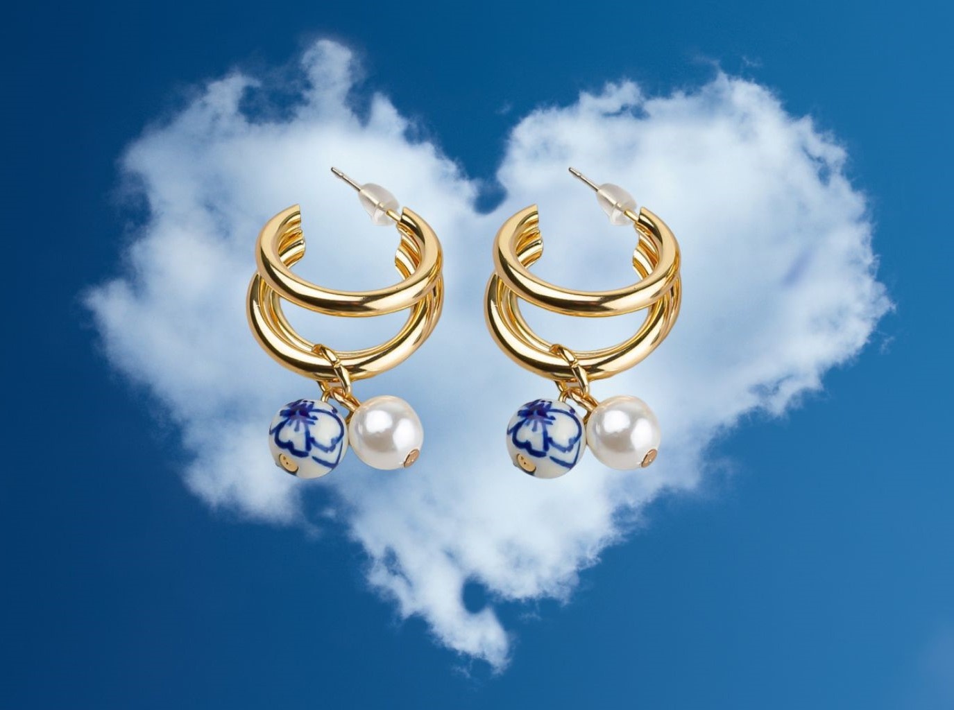 Stilvolle Doppelcreolen mit goldfarbenem Finish und einem ikonischen blauen Perlenanhänger. Diese nickelfreien Ohrstecker sind 4 cm lang und vereinen moderne Eleganz mit typisch niederländischem Charme.