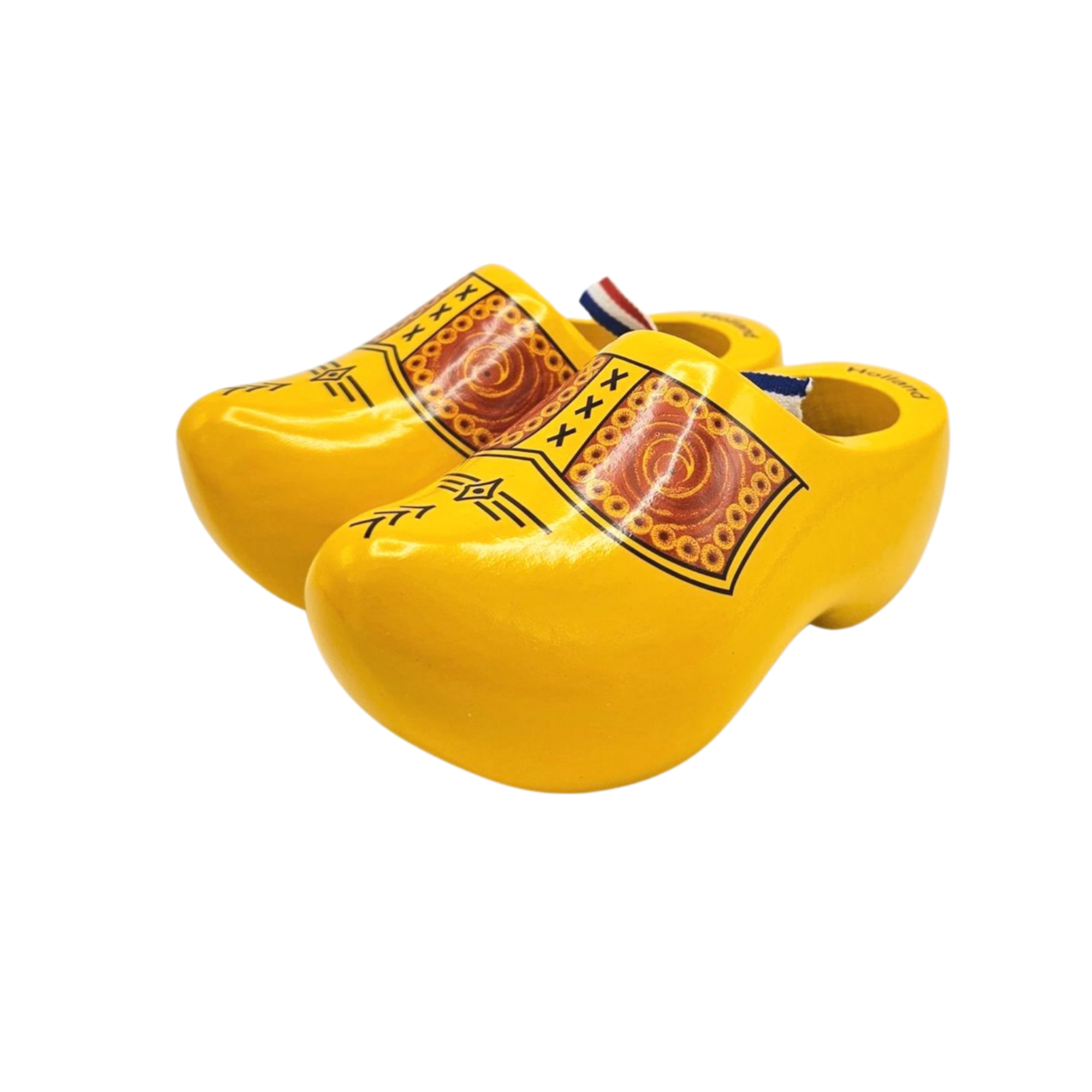 Original Clogs – Gelbe traditionelle Bauernpaspel, 8 cm. Ideal für eine fantastische Dekoration im Garten oder Haus. Die Clogs sind mit einem Band in den Farben Rot, Weiß und Blau ausgestattet.