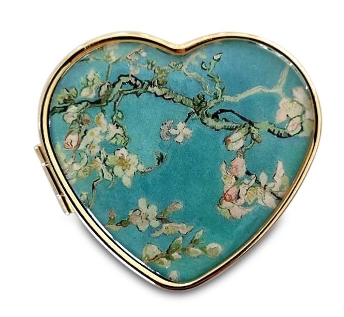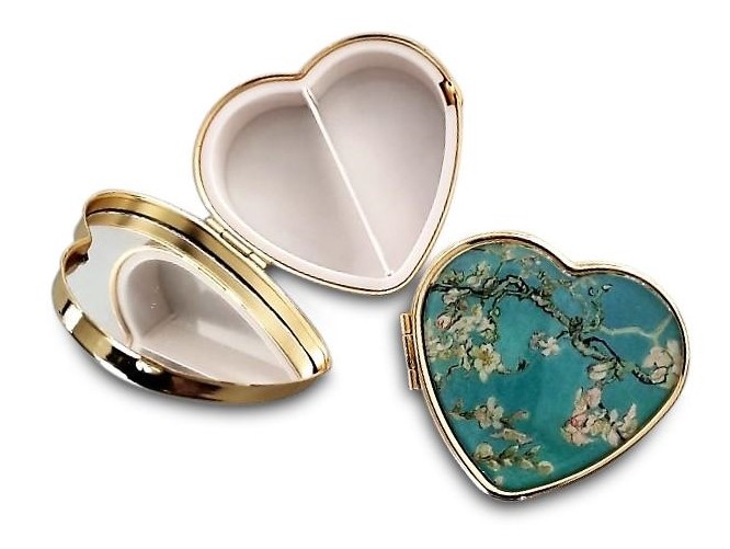 Pillendose (Herz) Mandelblüte Mit einem Druck auf den Knopf öffnen Sie die herzförmige Pillendose, die auch über einen Spiegel verfügt Größe: 6,4x6 x1,8cm Material: Edelstahl außen, Kunststoff innen Gewicht: +/- 45 Gramm