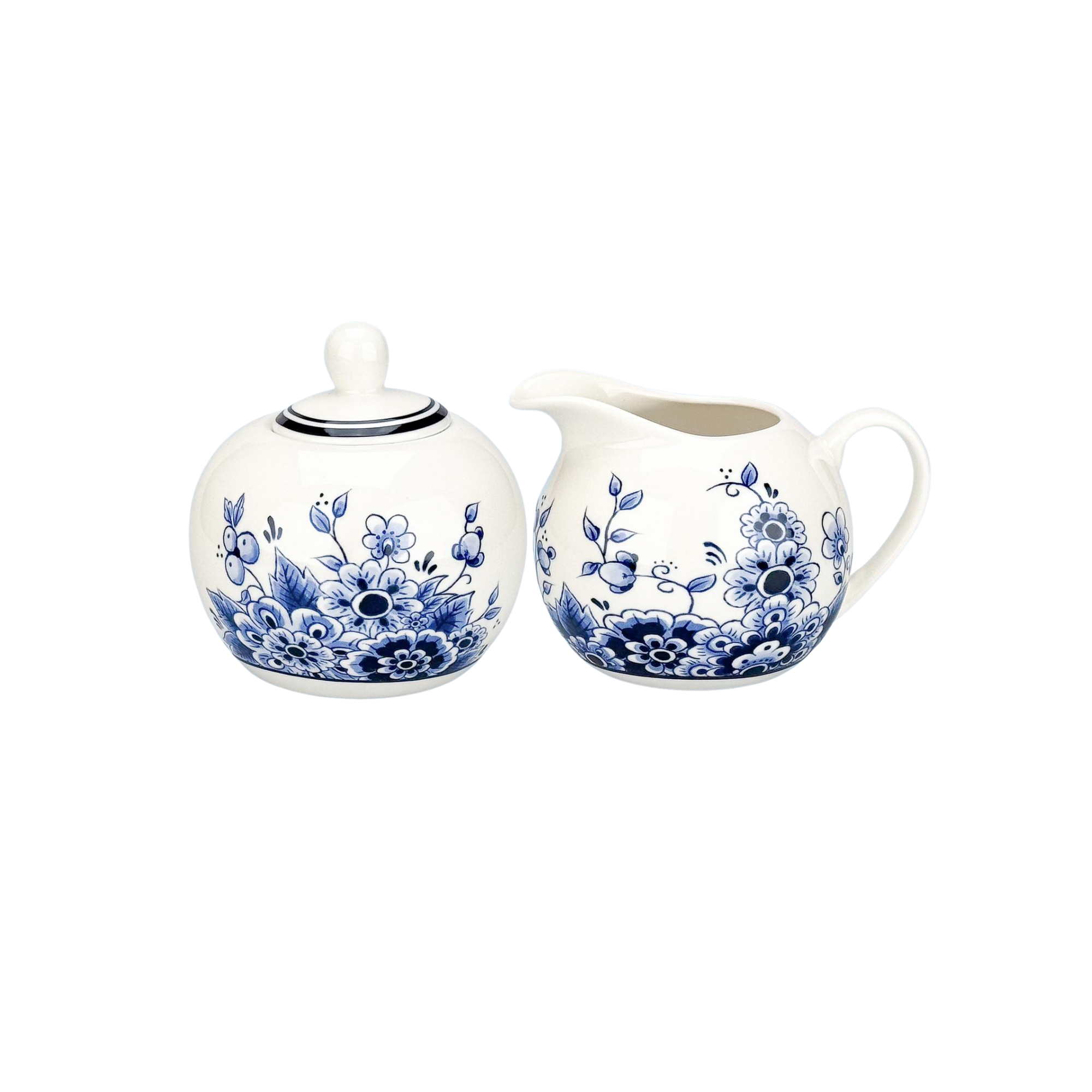 Ein elegantes, cremefarbenes Delfter-Blau-Set, bestehend aus einer Zuckerdose und einem Milchkännchen.