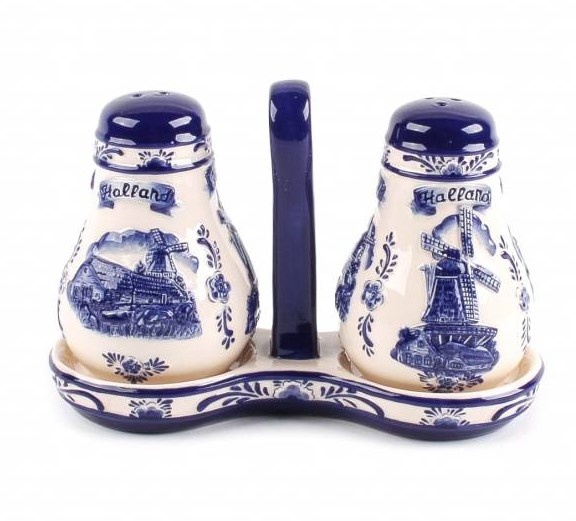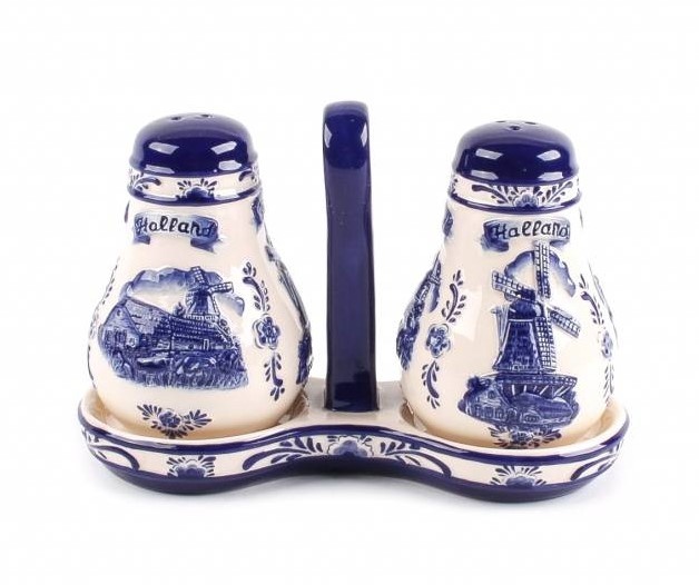 Dieses wunderschön verzierte Salz- und Pfefferset steht auf einem Plateau.