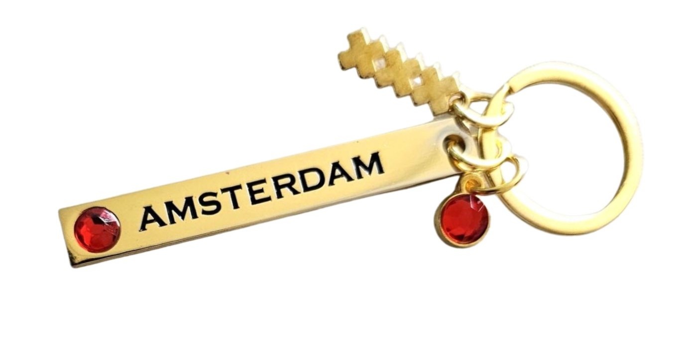 Schlüsselanhänger Amsterdam – Strasssteine Amsterdam-Buchstaben (auf goldfarbenem Streifen) Amsterdam-Streifen aus Metall und ein Strassstein Mit Anhänger – drei Amsterdamer Kreuze Und ein Strassanhänger Größe 7 cm