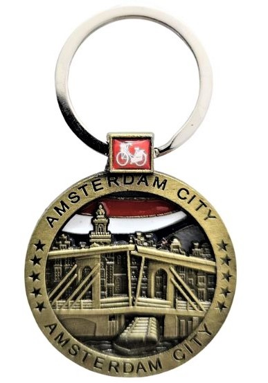 Schlüsselanhänger Amsterdam - Runder Amsterdam-Schlüsselanhänger (Text) Amsterdam City Amsterdam - dünne Brücke Mit Akzent eines Fahrrads. Größe einer runden Münze: 4 cm