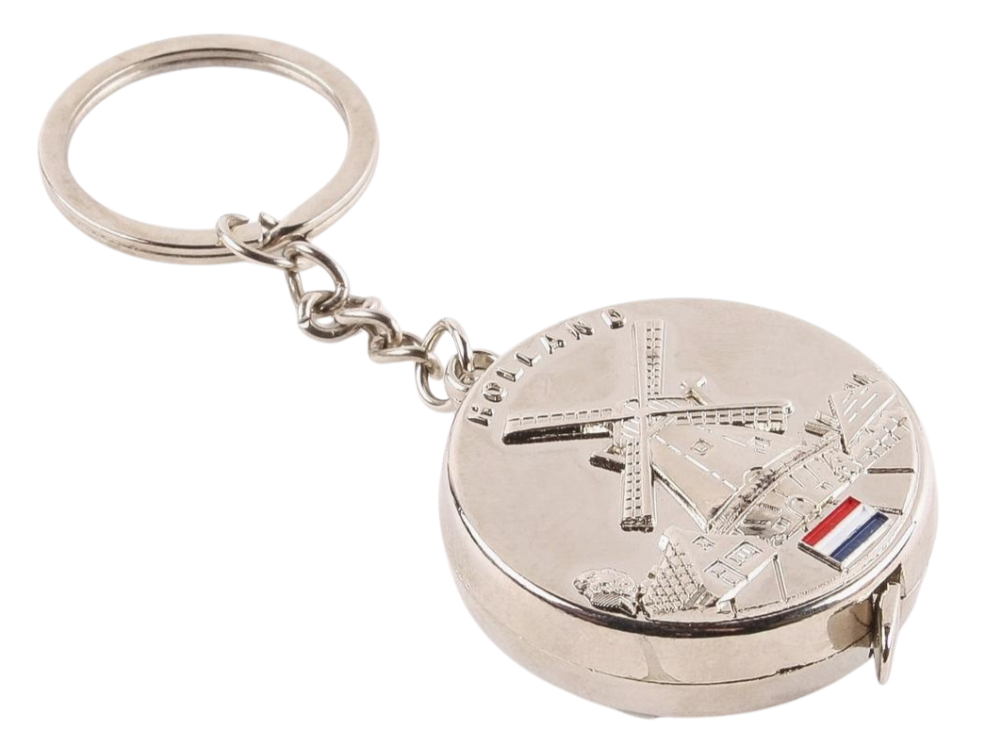 Schlüsselanhänger mit Maßband – mit holländischer Windmühlenlandschaft. Ein schöner, großer Schlüsselanhänger mit Maßband. Er ist immer griffbereit am Schlüsselbund. Maße: 105 x 40 x 10 mm. Silberfarben.
