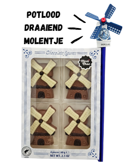 Leckere Milchschokoladenmühlen mit Bleistiftmühle in einer Geschenkpackung. Inhalt: 4 Stück. Gewicht: 60 Gramm. Delfter Blau-Bleistiftmühle